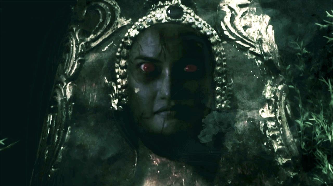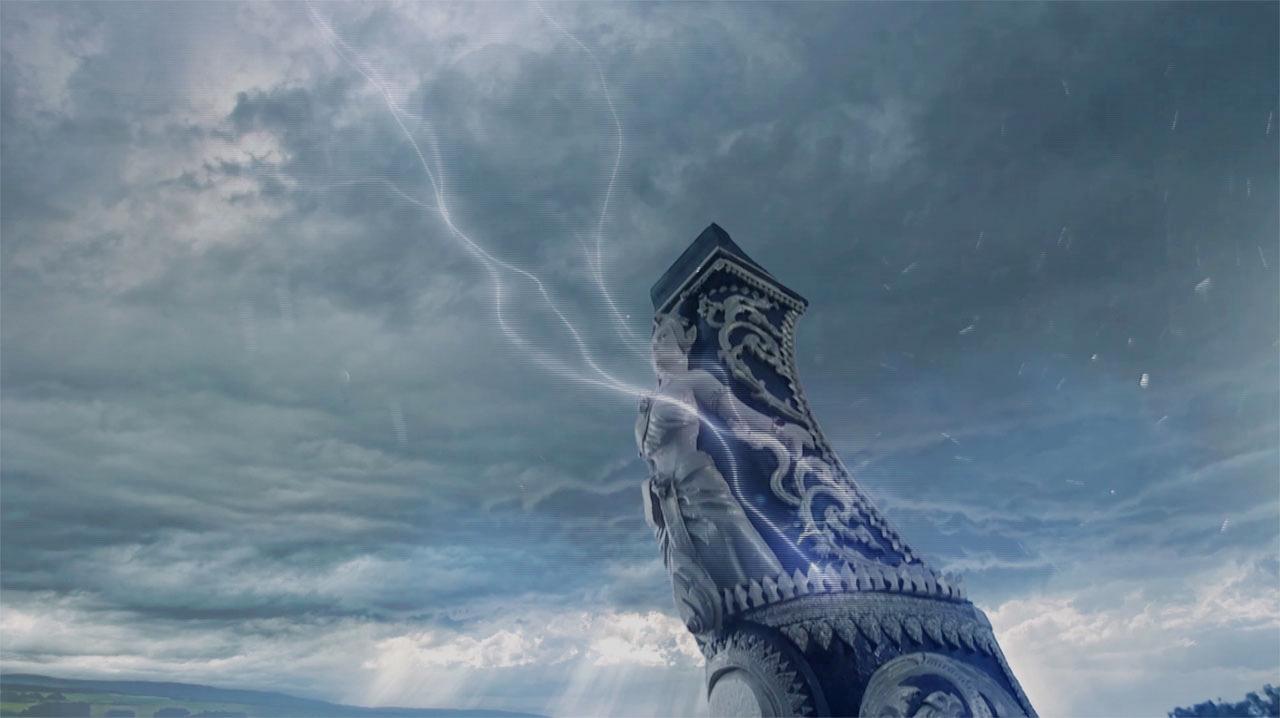 เป็นฉากที่ เมธาวลัย (จั๊กจั่น) อยู่บนเรือ ด้านริมฝั่ง เมธาวดี (น้ำหวาน) กำลังทำพิธีอยู่หน้าแท่น โดยมี กาหลง (หยา) พึมพำบทสวด เมธาวดี รับคนโทจากสาวใช้ มาราดน้ำสีแดงเข้มลงไปในแม่น้ำ จนเกิดแผ่นดินไหวยืนไม่อยู่ ทุกคนหนีตายกันอลหม่าน ภาคิไนย (กอล์ฟ) ตกใจ มองไปที่เรือของเมธาวลัยอย่างเป็นห่วง เห็นเรือเริ่มโคลง จึงตัดสินใจกระโดดลงไปช่วยเมธาวลัย เมธาวดีไม่ยอม กระโดดตามลงไป
