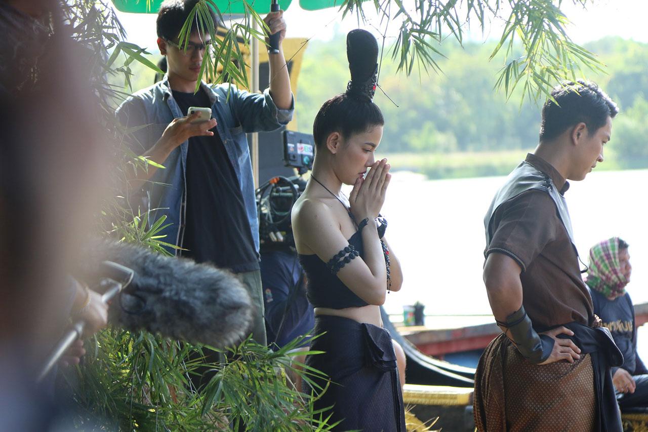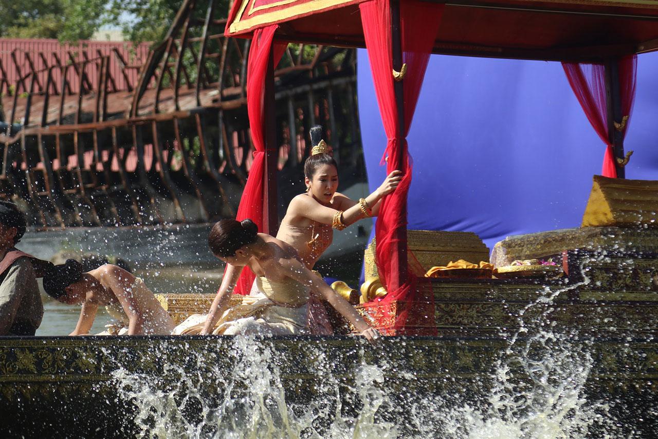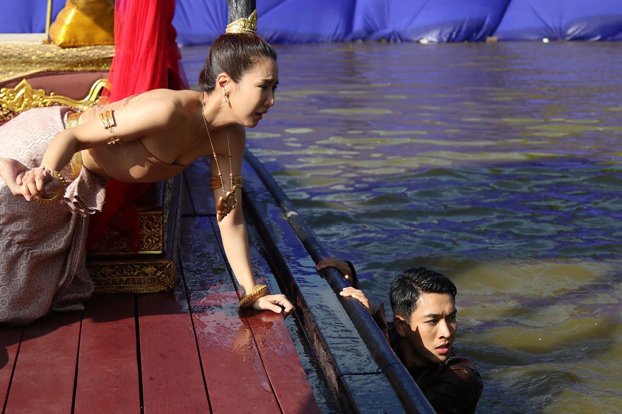 เบื้องหลังทีมงานยกกองไปถ่ายทำที่พร้อมมิตรสตูดิโอ กาญจนบุรี เป็นซีนใหญ่ ของเรื่อง งานนี้ทั้ง กอล์ฟ น้ำหวาน และจั๊กจั่นดูจะตื่นเต้นเป็นพิเศษเพราะทีมงานเซตเรือราชพิธี ดูสมจริงมาก แถมยังขนลุกสุด ๆ เพราะที่หัวเรือคือรูปแกะสลักของน้ำหวาน ทำเอาน้ำหวานเห็นต้องพนมมือไหว้เลยทีเดียว หันไปที่ฝั่งก็เป็นลานพิธีบวงสรวง แต่ที่ทำเอาทุกคน อ่อนเพลีย คงเป็นแสงแดดที่แผดเผาสุด ๆ ต่างคนก็ต่างโบกกันแดด แต่สำหรับหนุ่มกอล์ฟ งานนี้ขอชิงเล่นตัวเองว่า ผมคงไม่เขียวไปกว่านี้แล้วคร้าบ ฮ่า ๆ ด้านฉากเรือที่ต้องเจอพายุจนตกน้ำ เรือโยกแทบล่ม ทีมงานก็ได้ยกพัดลมยักษ์ ถึง 2 ตัวมาเป่าใส่ตัวนักแสดง งานนี้เกาะไม่ดีมีตัวปลิวแน่ ๆ จ้า
