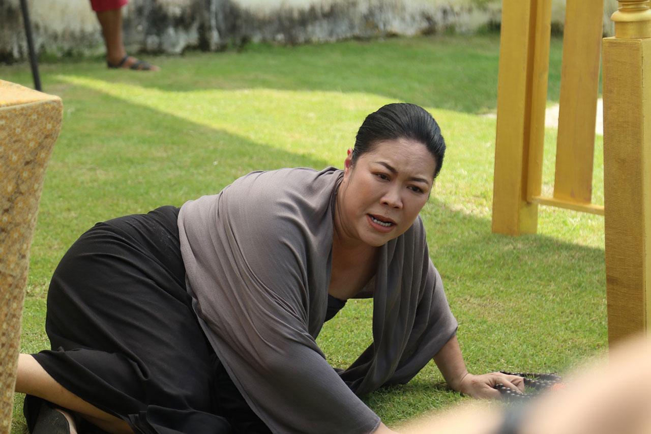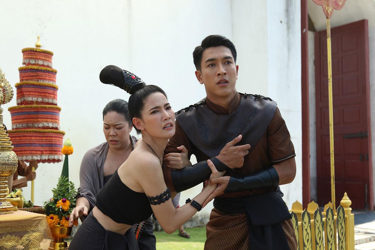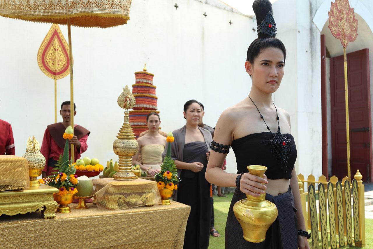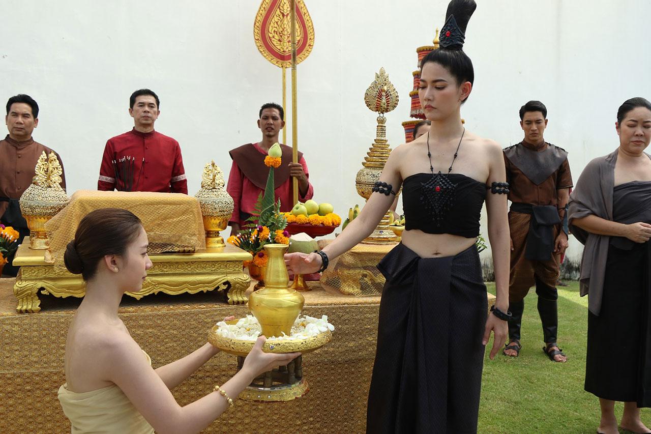 เบื้องหลังทีมงานยกกองไปถ่ายทำที่พร้อมมิตรสตูดิโอ กาญจนบุรี เป็นซีนใหญ่ ของเรื่อง งานนี้ทั้ง กอล์ฟ น้ำหวาน และจั๊กจั่นดูจะตื่นเต้นเป็นพิเศษเพราะทีมงานเซตเรือราชพิธี ดูสมจริงมาก แถมยังขนลุกสุด ๆ เพราะที่หัวเรือคือรูปแกะสลักของน้ำหวาน ทำเอาน้ำหวานเห็นต้องพนมมือไหว้เลยทีเดียว หันไปที่ฝั่งก็เป็นลานพิธีบวงสรวง แต่ที่ทำเอาทุกคน อ่อนเพลีย คงเป็นแสงแดดที่แผดเผาสุด ๆ ต่างคนก็ต่างโบกกันแดด แต่สำหรับหนุ่มกอล์ฟ งานนี้ขอชิงเล่นตัวเองว่า ผมคงไม่เขียวไปกว่านี้แล้วคร้าบ ฮ่า ๆ ด้านฉากเรือที่ต้องเจอพายุจนตกน้ำ เรือโยกแทบล่ม ทีมงานก็ได้ยกพัดลมยักษ์ ถึง 2 ตัวมาเป่าใส่ตัวนักแสดง งานนี้เกาะไม่ดีมีตัวปลิวแน่ ๆ จ้า