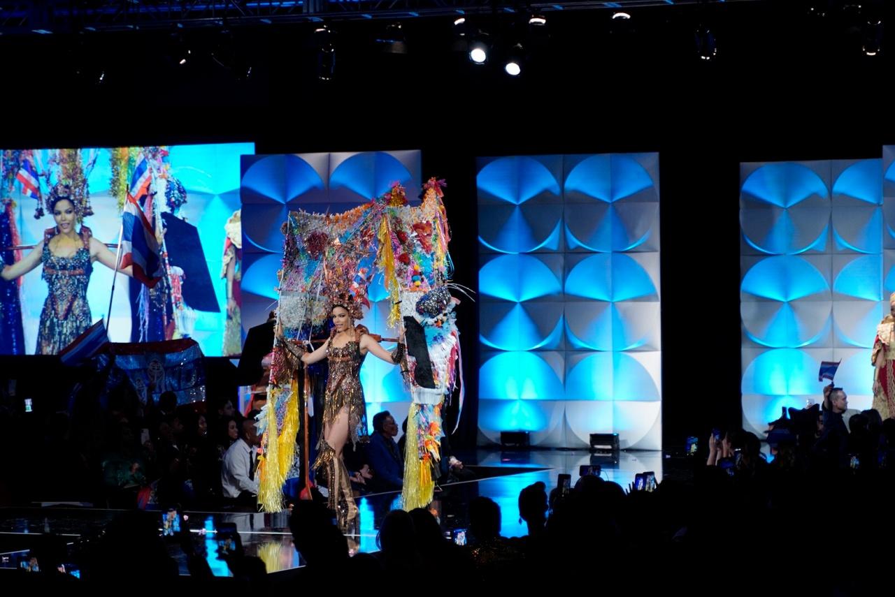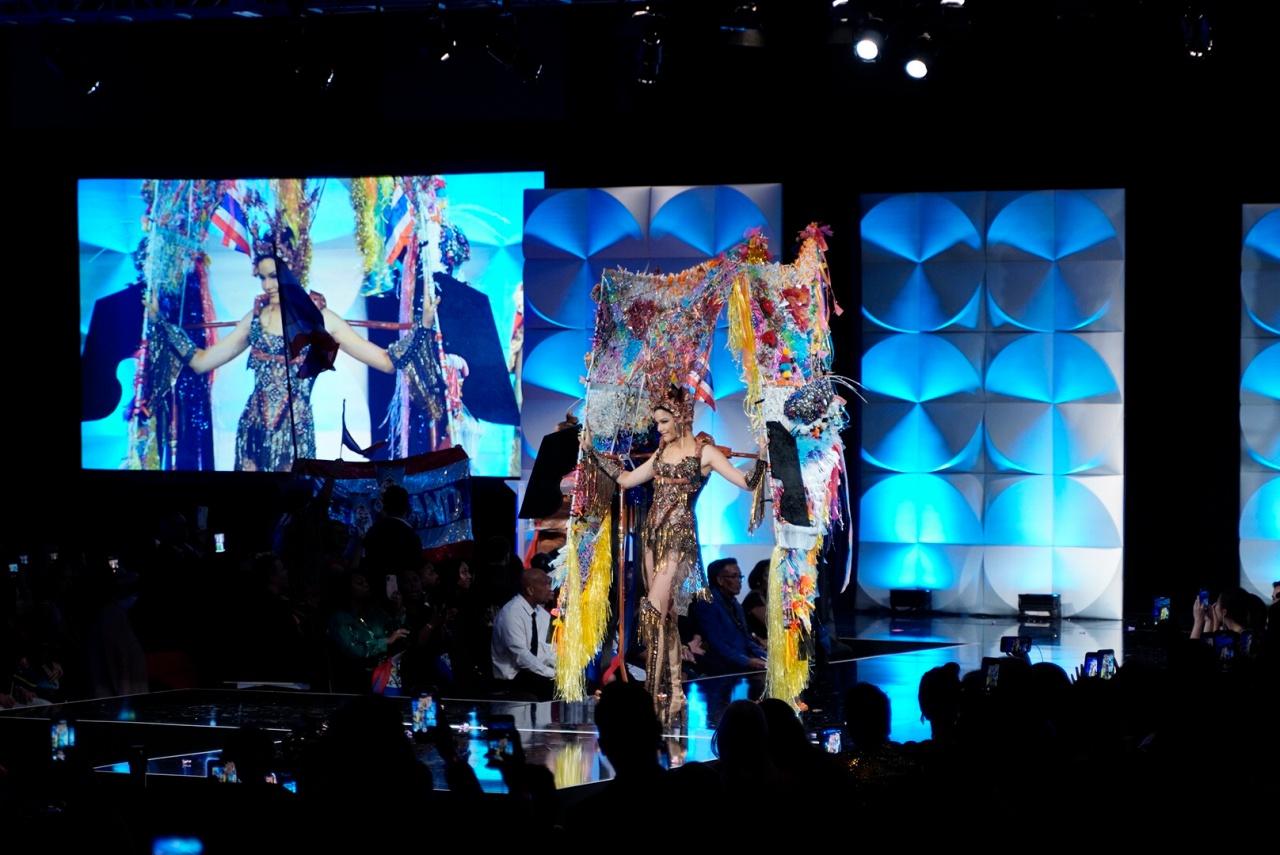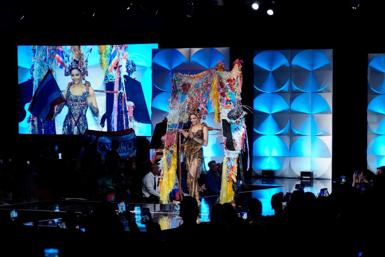 ซึ่งชุดที่ออกแบบอย่างงดงามร่วมสมัย ตระการตายิ่งขึ้นเมื่อกระทบแสงไฟเวทีจักรวาล เรียกเสียงปรบมือและความชื่นชมเมื่อทุกคนได้เห็นลวดลายผ้าภาคอีสานของไทยด้วยฝีมือการปักหลายเทคนิค ประกอบด้วยเครื่องศีรษะ และหน้ากากผีตาโขนขนาดใหญ่ที่มีความสูงถึง 2.5 เมตร ที่มีการนำวัสดุเหลือใช้มาอัพไซเคิลประกอบตกแต่งสร้างคุณค่าด้วยฝีมือศิลปิน โดยชาวไทย ณ วัดพุทธบูชาแห่งรัฐจอร์เจีย แอตแลนตา สหรัฐอเมริกา ได้รับไม้ต่อจากชาวไทยที่ประเทศไทย มีส่วนช่วยอยู่เบื้องหลังชุดประจำชาติไทยที่อลังการบนเวทีจักรวาลในปีนี้ นับได้ว่าเป็นชุดแห่งความร่วมแรงร่วมใจเพื่อศักดิ์ศรีแห่งชาติไทยเลยทีเดียว