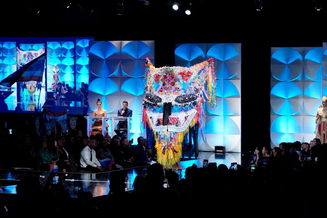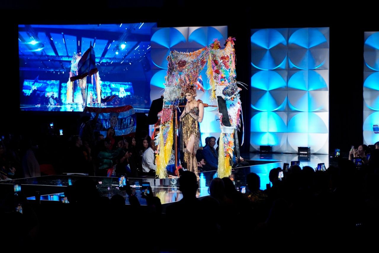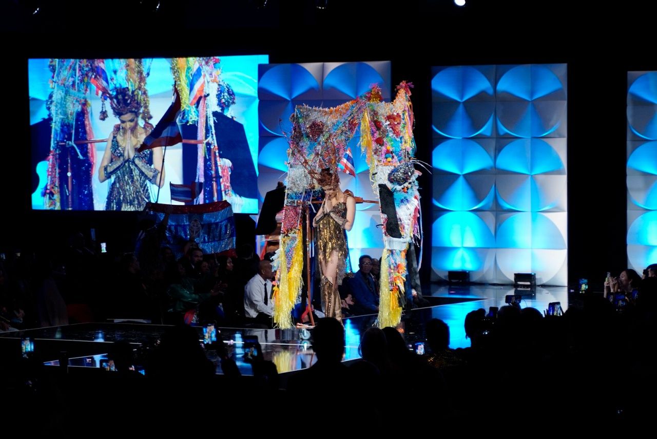 ซึ่งชุดที่ออกแบบอย่างงดงามร่วมสมัย ตระการตายิ่งขึ้นเมื่อกระทบแสงไฟเวทีจักรวาล เรียกเสียงปรบมือและความชื่นชมเมื่อทุกคนได้เห็นลวดลายผ้าภาคอีสานของไทยด้วยฝีมือการปักหลายเทคนิค ประกอบด้วยเครื่องศีรษะ และหน้ากากผีตาโขนขนาดใหญ่ที่มีความสูงถึง 2.5 เมตร ที่มีการนำวัสดุเหลือใช้มาอัพไซเคิลประกอบตกแต่งสร้างคุณค่าด้วยฝีมือศิลปิน โดยชาวไทย ณ วัดพุทธบูชาแห่งรัฐจอร์เจีย แอตแลนตา สหรัฐอเมริกา ได้รับไม้ต่อจากชาวไทยที่ประเทศไทย มีส่วนช่วยอยู่เบื้องหลังชุดประจำชาติไทยที่อลังการบนเวทีจักรวาลในปีนี้ นับได้ว่าเป็นชุดแห่งความร่วมแรงร่วมใจเพื่อศักดิ์ศรีแห่งชาติไทยเลยทีเดียว