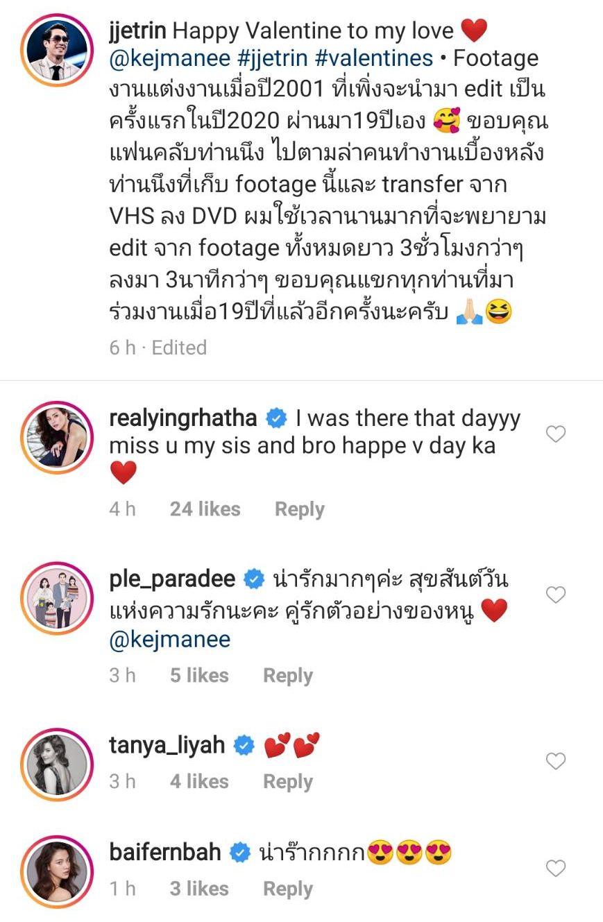 โดย เจ เจตริน โพสต์คลิปดังกล่าวพร้อมทั้งเขียนแคปชั่นถึงวันสำคัญในชีวิตเมื่อ 19 ปีที่แล้วว่า “Happy Valentine to my love @kejmanee #jjetrin #valentines Footage งานแต่งงานเมื่อปี 2001 ที่เพิ่งจะนำมา edit เป็นครั้งแรกในปี 2020 ผ่านมา 19 ปีเอง ขอบคุณแฟนคลับท่านนึง ไปตามล่าคนทำงานเบื้องหลังท่านนึงที่เก็บ footage นี้และ transfer จาก VHS ลง DVD ผมใช้เวลานานมากที่จะพยายาม edit จาก footage ทั้งหมดยาว 3 ชั่วโมงกว่าๆ ลงมา 3 นาทีกว่าๆ ขอบคุณแขกทุกท่านที่มาร่วมงานเมื่อ 19 ปีที่แล้วอีกครั้งนะครับ”