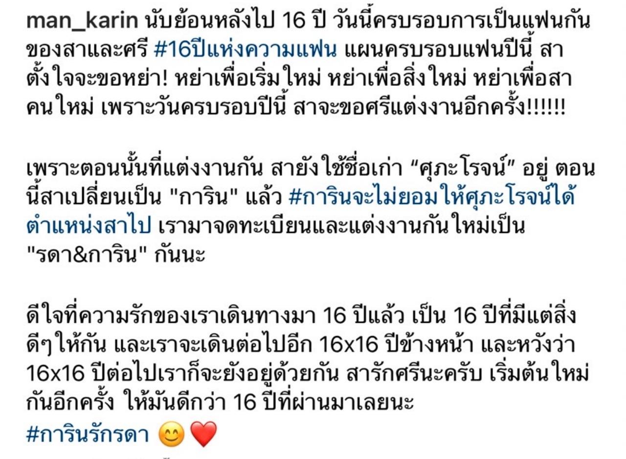 ดีใจที่ความรักของเราเดินทางมา 16 ปีแล้ว เป็น 16 ปีที่มีแต่สิ่งดีๆให้กัน และเราจะเดินต่อไปอีก 16x16 ปีข้างหน้า และหวังว่า 16x16 ปีต่อไปเราก็จะยังอยู่ด้วยกัน สารักศรีนะครับ เริ่มต้นใหม่กันอีกครั้ง ให้มันดีกว่า 16 ปีที่ผ่านมาเลยนะ #การินรักรดา"