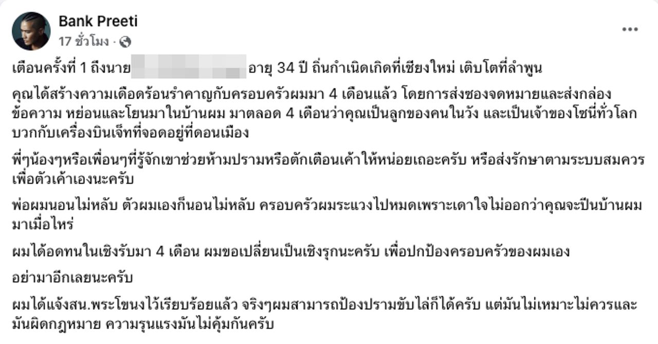 "เตือนครั้งที่ 1 ถึงนาย... อายุ 34 ปี ถิ่นกำเนิดเกิดที่เชียงใหม่ เติบโตที่ลำพูน คุณได้สร้างความเดือดร้อนรำคาญกับครอบครัวผมมา 4 เดือนแล้ว โดยการส่งซองจดหมายและส่งกล่องข้อความ หย่อนและโยนมาในบ้านผม มาตลอด 4 เดือนว่าคุณเป็นลูกของคนในวัง และเป็นเจ้าของโซนี่ทั่วโลก บวกกับเครื่องบินเจ็ทที่จอดอยู่ที่ดอนเมือง