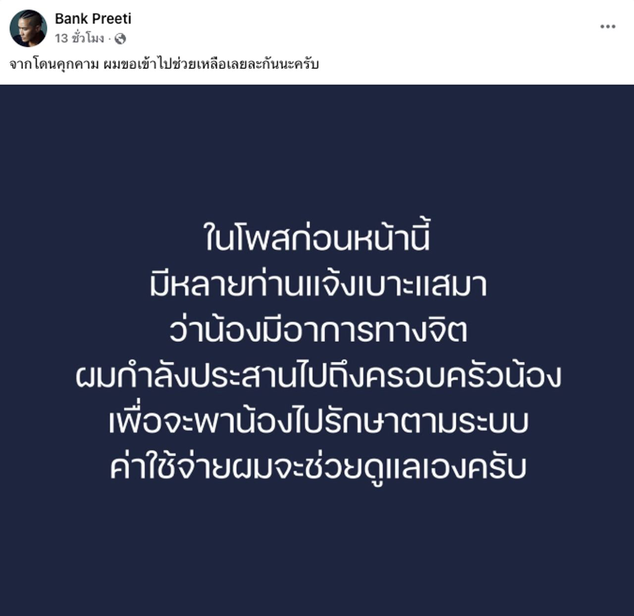 หลังจากที่โพสต์ข้อความเตือนครั้งที่ 1 ไปได้ไม่นานเจ้าตัวก็ได้โพสต์ข้อความต่ออีกว่า "ในโพสต์ก่อนหน้านี้ มีหลายท่านแจ้งเบาะแสมา ว่าน้องมีอาการทางจิต ผมกำลังประสานไปถึงครอบครัวน้อง เพื่อจะพาน้องไปรักษาตามระบบ ค่าใช้จ่ายผมจะช่วยดูแลเองครับ"