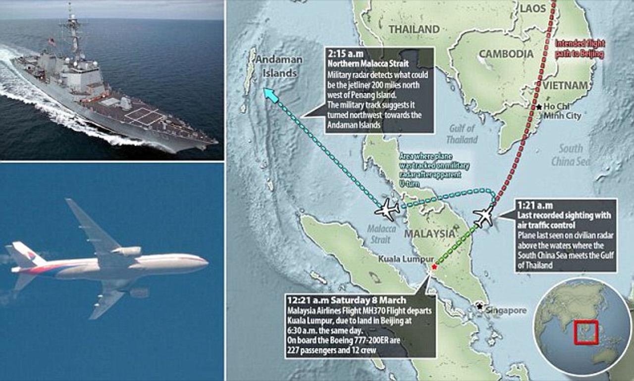 ขณะนี้ไม่มีใครสามารถมองเห็น MH370 ได้ เนื่องจากความมืดมิดเหนือมหาสมุทรอินเดีย ทั้งเรดาร์หรือการมองเห็นจากเครื่องบินลำอื่นๆ ก็ไม่สามารถตรวจพบ กัปตันนำเอาแผนการบินสำรองหลังจากโปรแกรมแผนการบินใหม่ใส่ลงในคอมพิวเตอร์พกพา นักบินโดยทั่วไปจะคุ้นเคยกับแผนสำรองการบินตลอดเวลา แม้ในระหว่างทำการบิน เนื่องจากหากเกิดเหตุฉุกเฉินจะได้มีสนามบินสำรองให้ร่อนลงฉุกเฉิน แผนการบินสำรองที่กัปตันใช้ ทำให้ระบบนักบินกลทำงานตามเส้นทางใหม่ที่ถูกโปรแกรมลงไป เครื่อง Boeing 777-200ER เริ่มต้นการเลี้ยวไปยังทิศตะวันตกเฉียงใต้ มุ่งตรงออกไปสู่มหาสมุทรที่กว้างใหญ่ไพศาล กัปตันหยิบหน้ากากออกซิเจนออกมาใส่พร้อมๆ กับไต่ระดับความสูงไปที่ 45,000 ฟุต สันนิษฐานหรือคาดเดาเอาเองว่าเพื่อต้องการหลบเลี่ยงการตรวจจับของเรดาร์จากศูนย์ควบคุมการจราจรทางอากาศของพลเรือน และเพื่อให้แน่ใจได้ว่าจะไม่มีใครบนเครื่องสามารถใช้โทรศัพท์มือถือในขณะนั้นได้อีก