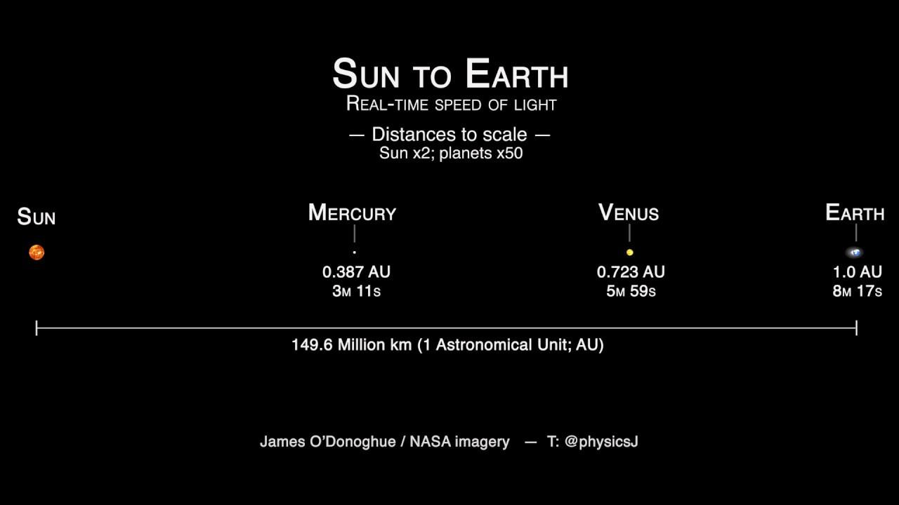 2.5 นาที จะถึงดาวศุกร์ ที่อยู่ห่างจากเรา 41.4 ล้านกิโลเมตร ใช้เวลาไป 5 นาที แค่รอกาแฟที่สั่งในร้านคนเยอะ คุณจะถึงดาวพุธ ที่อยู่ไกลจากโลก 91.7 ล้านกิโลเมตร และใช้เวลา 8.3 นาที คุณจะบินไปถึงดวงอาทิตย์ ซึ่งอยู่ห่างจากโลก 149 ล้านกิโลเมตร