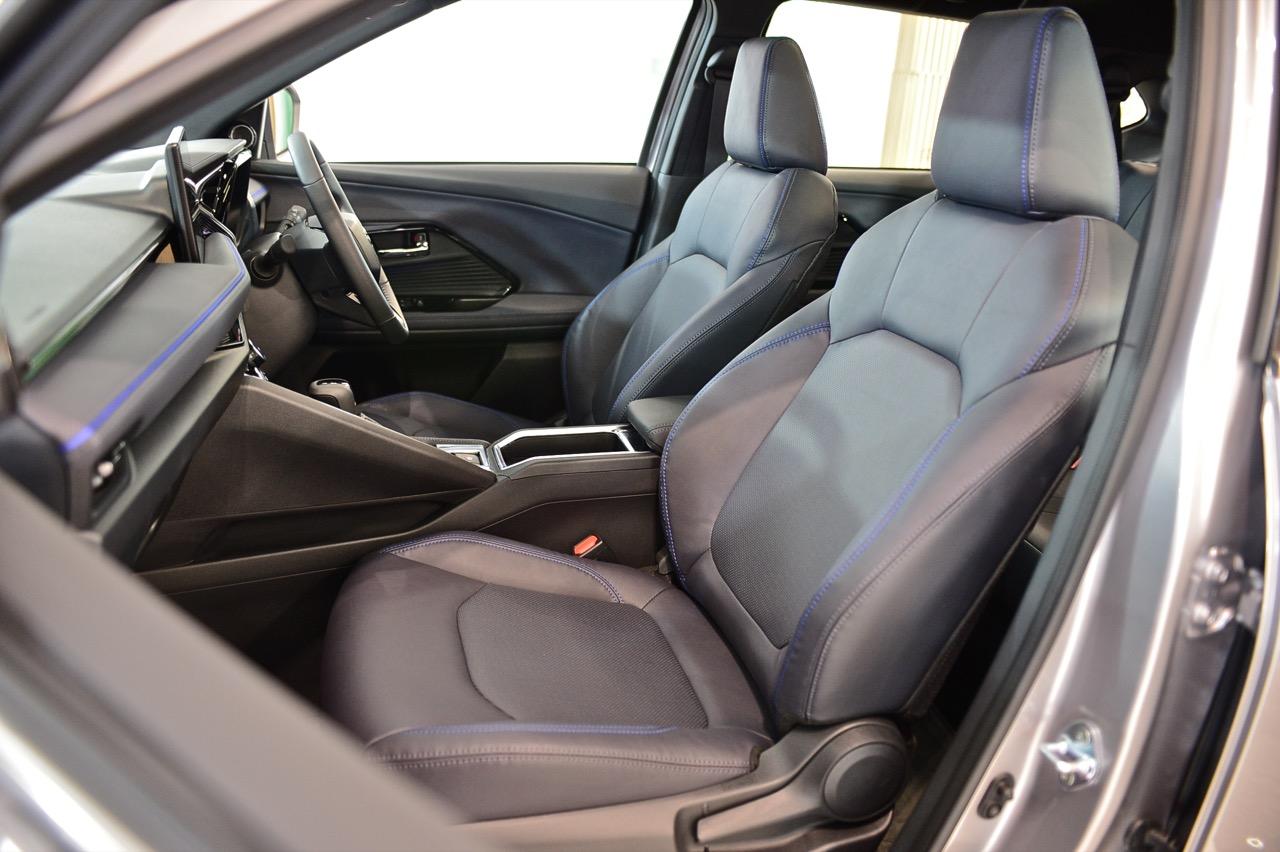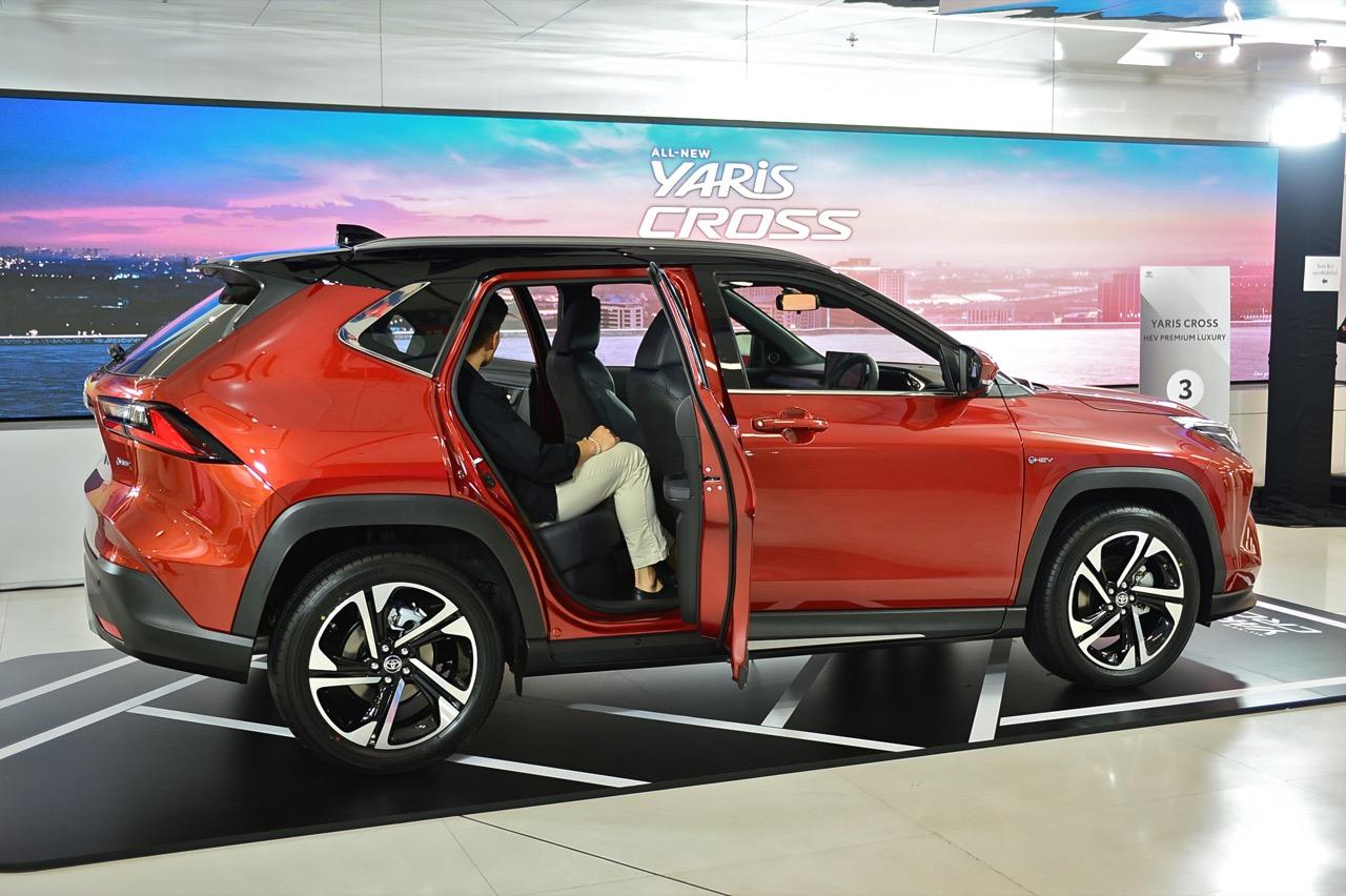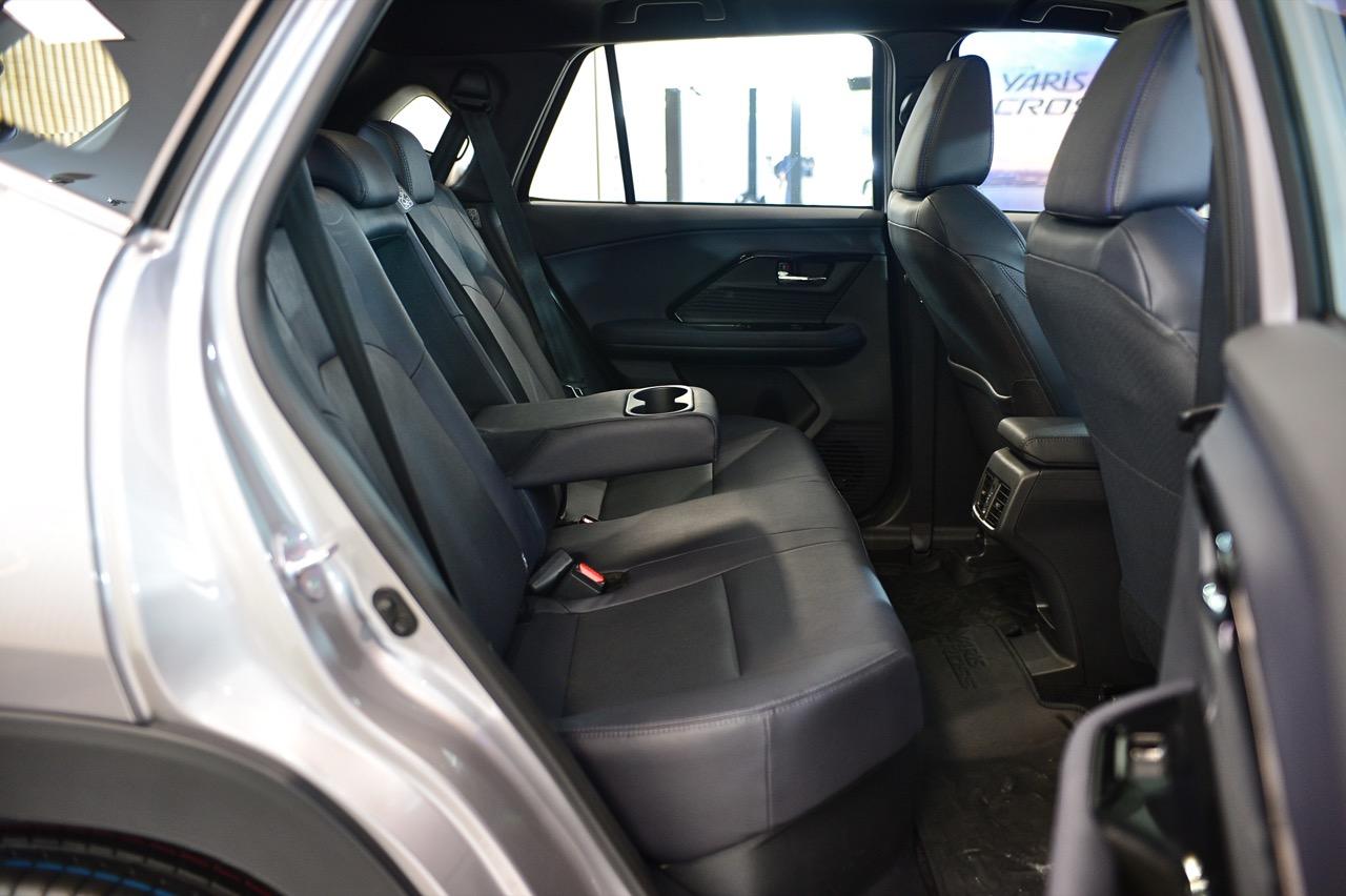ภายในของ Yaris Cross HEV Premium คล้ายกับ HEV Premium Luxury แต่รุ่นรองท็อปไม่มี Panoramic Roof เบาะหุ้มหนังสีเทาเย็บเดินตะเข็บด้วยด้ายสีฟ้า เบาะคนขับปรับไฟฟ้า 8 ทิศทาง เบาะคนนั่งหน้ายังใช้การปรับมือ เบาะหลังแบบสามที่นั่ง นั่งสองคนจะสบายตัวกว่ามาก ทุกตำแหน่งมาพร้อมเข็มขัดนิรภัย เบาะคนขับนั่งสบาย โดยเฉพาะปีกเบาะที่โอบกระชับลำตัว วัสดุภายในนุ่มหนา เบาะหลังมีพื้นที่วางขาพอสมควรสำหรับคนตัวสูงกว่า 175 เซนติเมตร นั่งแล้วยังเหลือพื้นที่ใกล้หัวเข่าพอสมควร ส่วนพื้นที่เหนือศีรษะก็มากพอที่จะไม่ทำให้รู้สึกอึดอัด ดีไซน์ใหม่ของแผงประตูที่ดูดี ทั้งพลาสติกสีดำเงากับมือจับที่เปิดประตูโครเมียม
