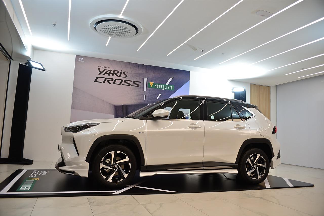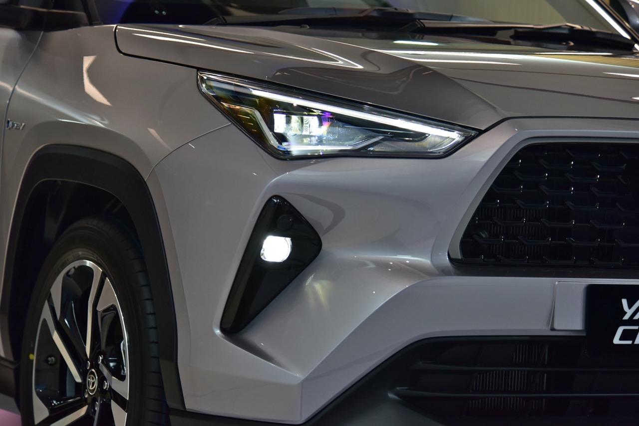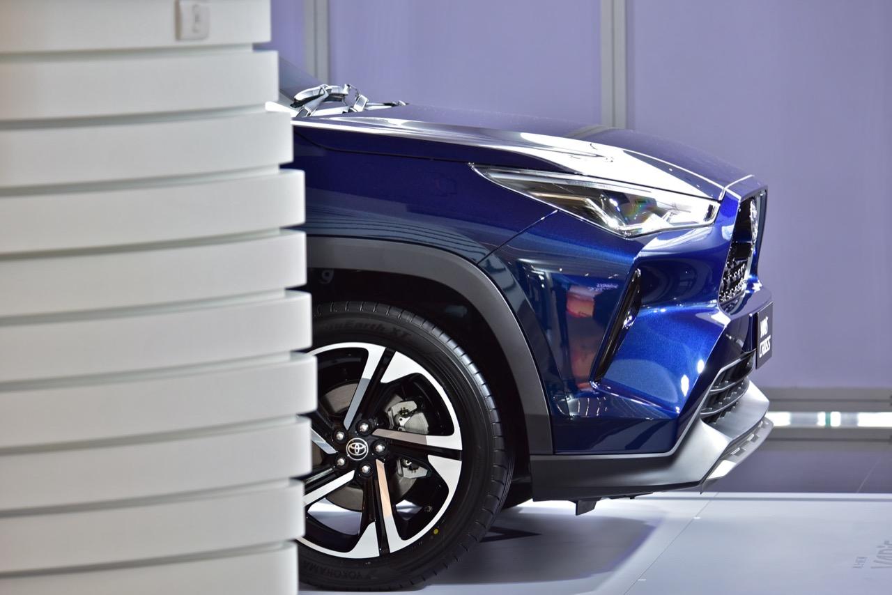 หน้าตาที่เน้นกระจังทรงสี่เหลี่ยมคางหมู ลายภายในกระจังรูปตัวยู ทำจากพลาสติกสีดำเงา ไฟหน้า LED ไฟหรี่กลางวัน LED และไฟตัดหมอกทรงกลมก็ยังใช้หลอด LED อีกเช่นกัน การออกแบบให้กันชนหลอมรวมเป็นชิ้นเดียวกับชุดครอบกระจังหน้าเพื่อลดชิ้นส่วนเพิ่มเติม ช่องรับอากาศใต้กันชนขนาดใหญ่นำกระแสลมเย็นไประบายความร้อนให้กับแผงหม้อน้ำ ฝากระโปรงหน้ายกเหลี่ยมมุมสอดรับกับแนวของไฟหน้า เป็นงานออกแบบตามสมัยนิยมที่พบเห็นกันทั่วไป แก้มข้างมีพลาสติกกันกระแทกสีดำ ล้ออัลลอยขอบ 17 นิ้ว ห่อรัดด้วยยาง Yokohama Bluearth XT AE61 ไซส์ 215/60R17 96H ใน Yaris Cross รุ่น HEV Premium กับ HEV Smart ส่วนรุ่นท็อป HEV Premium Luxury ใส่ล้ออัลลอยขอบ 18 นิ้ว ยาง Yokohama Bluearth XT AE61 ไซส์ 215/55R18 96H
