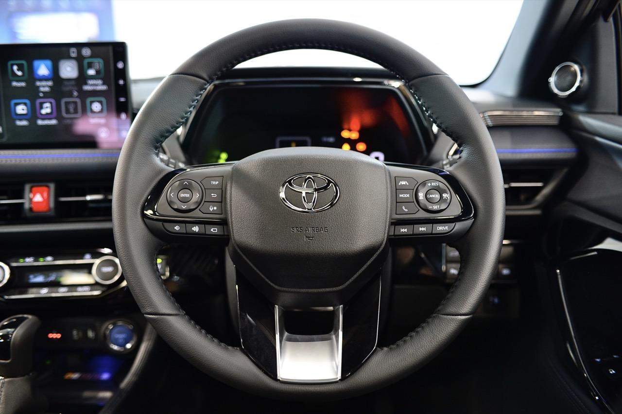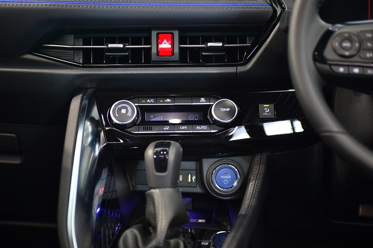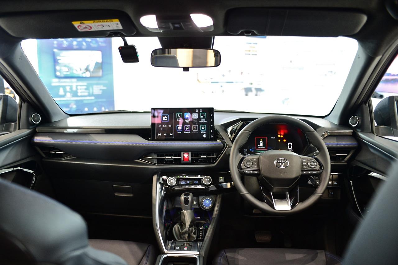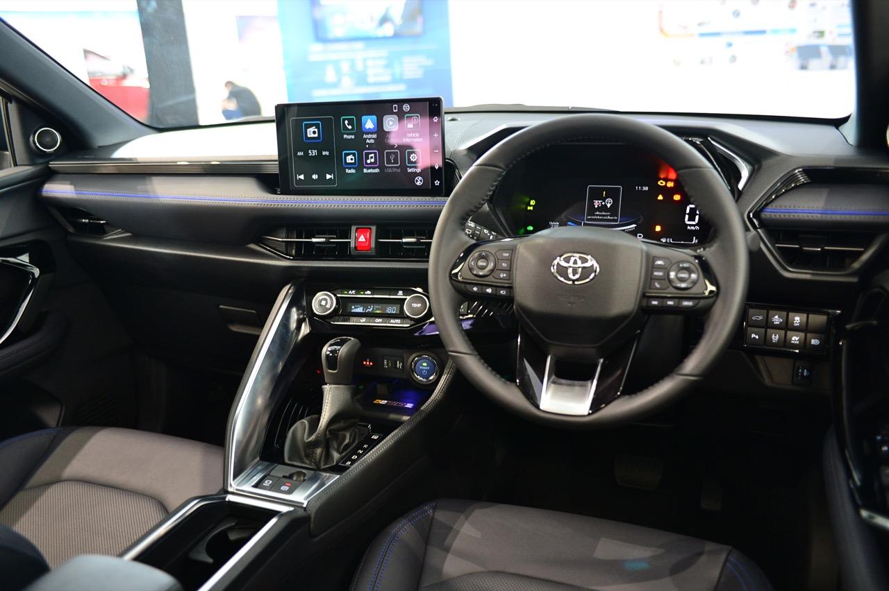 แดชบอร์ดของ Yaris Cross มีรายละเอียดที่ซับซ้อนจากการออกแบบ พลาสติกสีดำเงาตามกรอบของช่องแอร์และมาตรวัด กึ่งกลางของแดชบอร์ดหุ้มด้วยไวนิลเย็บเดินตะเข็บด้วยด้ายสีฟ้า พวงมาลัยหุ้มหนังแท้ทรงสามก้านแบบใหม่ มีสวิชท์มัลติฟังก์ชันที่ก้านพวงมาลัย โดยเฉพาะสวิตช์ระบบปรับตั้งความเร็วอัตโนมัติ Adaptive Cruise Control All Speed with Stop & Go ที่ก้านวงด้านขวา มาตรวัดจอภาพ TFT LCD ขนาด 7 นิ้ว ประกอบด้วยสเกลวัดพลังงานในตำแหน่ง Charge / Eco / Power ระดับเชื้อเพลิงในถังและระยะทางที่วิ่งถึง อุณหภูมิภายนอก ทริปมิเตอร์ ตัวเลขสปีดความเร็วแบบดิจิทัลฯ รวมถึงการปรับตั้งระบบความปลอดภัยต่างๆ ผ่านจอภาพมาตรวัดตรงหน้าคนขับ