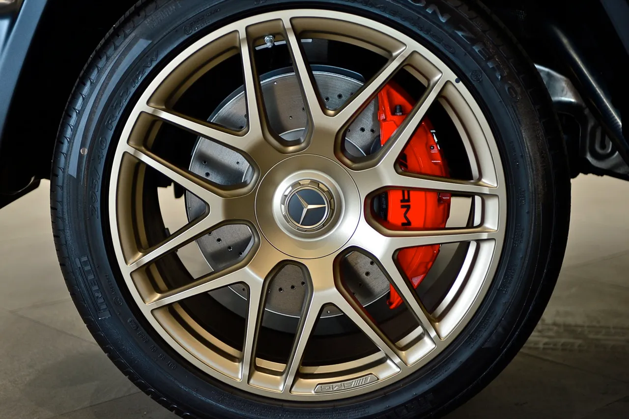 แม้แต่ล็อกของกลอนประตู ก็มีเสียงเหมือนคุณกำลังขึ้นลำหรือกระชากลูกเลื่อนปืนไรเฟิล .458 ตราสัญลักษณ์ G63 ติดอยู่กับตัวถังแบบกล่องที่ด้านหลัง จากความจงใจในการออกแบบ G-Class ทำให้รถเอสยูวีรุ่นนี้ มีรูปลักษณ์ที่ไม่เหมือนใคร มันยังมาพร้อมกับความทนทาน จากจุดประสงค์ในตัวของมันเอง ที่จับประตูต้องกดปุ่มขนาดใหญ่และใช้ความพยายามด้วยการออกแรงเพื่อเปิดหรือปิดมากกว่าปกติ การเปิดและปิดประตูของ G63 ถือเป็นประสบการณ์ที่น่าพึงพอใจที่สุดเท่าที่เคยมีมา บังโคลนขนาดใหญ่ที่ออกแบบเอาไว้เผื่อในการลุยหนัก ประตูรถมีบานพับแบบเปลือย ประตูฝาท้ายด้านหลังที่เปิดออกด้านข้างแทนที่จะยกขึ้นเหมือนฝาท้ายของรถเอสยูวีทั่วไป AMG G63 มาพร้อมกับแพ็กเกจงานตกแต่งพิเศษที่เจ้าของจะต้องจ่ายเงินเพิ่มอีกหลายล้าน ยาง Pirelli Scorpion ZERO 295/40R22 สำหรับลุยทุกพื้นที่ บนล้อ AMG สีทอง ขนาด 22 นิ้ว