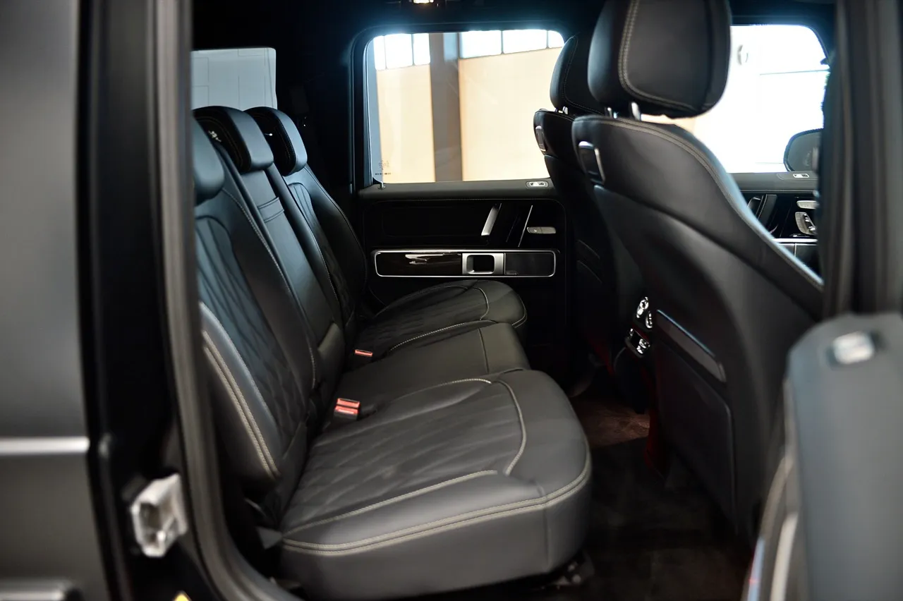 ภายใน G63 ได้รับการตกแต่งอย่างสวยงามด้วยหนัง Nappa และ Alcantara พร้อมด้วยวัสดุเปียโนแบล็กที่ช่วยรักษาสุขภาพจิตของคนขับด้วยขอบทริมสีดำเปียโนแบล็กที่ล้อมกรอบชุดคอมมานด์คอนโทรลและที่แผงประตูซึ่งต่อเชื่อมกับที่เปิดประตูและกรวยลำโพงได้อย่างลงตัว (อยากได้คาร์บอนไฟเบอร์แบบโชว์ลายมากกว่า) เบาะนั่งหนังแท้เย็บเดินตะเข็บด้วยด้ายสีขาว เบาะนั่งด้านหน้ามีระบบแอร์เป่าช่วยทำความเย็นให้กับตัวเบาะ ระบบนวดเพื่อความผ่อนคลาย การปรับแต่งภายในทำได้ดี เบาะคู่หน้าเป็นตำแหน่งที่นั่งที่สะดวกสบายสุดๆ ตำแหน่งการขับ กับกระจกบังลมบานหน้าที่วางอยู่ในแนวเกือบจะตั้งฉาก เปิดมุมมองด้านหน้าให้เห็นทัศนวิสัยรอบตัวอย่างชัดเจน