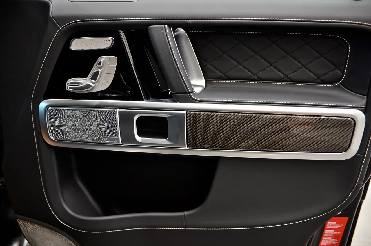 ชิ้นงานตกแต่งห้องโดยสารบางส่วนทำจากหนังพลาสติกเกรดสูงและโลหะ หนังนุ่มที่ครอบคลุมทุกพื้นผิวสัมผัส ช่องแอร์สไตล์กังหัน งานอะลูมิเนียมขัดเงาผสมกับคาร์บอนไฟเบอร์โชว์ลวดลาย ที่จับของผู้โดยสารตอนหน้าประทับตรา G Manufaktur เย็บเดินตะเข็บคู่ด้วยด้ายสีชาว คุณภาพงานประกอบภายในของ Mercedes-AMG นั้นไร้จุดบกพร่อง อุปกรณ์ในโซนคนขับสร้างความประทับใจในการใช้งาน ทุกอย่างของมันดูหรูหรา แม้แต่แผงบุหลังคาก็ยังใช้วัสดุคล้ายหนังกลับเนื้อนุ่ม ไฟส่องสว่างภายในที่ปรับแต่งได้ 64 เฉดสี G63 ยังมีระบบ infotainment และเทคโนโลยีช่วยเหลือผู้ขับที่ทันสมัย โดยทั่วไปแล้วทั้งหมดนี้ง่ายต่อการปรับตั้ง ผ่าน mercedes comand control เชื่อมต่อ Apple CarPlay อย่างรวดเร็ว ระบบนำทางของ G63 ใช้งานง่ายผ่านคำสั่งเสียง Bluetooth เชื่อมต่อแล้วไม่หลุด รวมถึงระบบเสียง Burmeister ที่มีกรวยลำโพงโชว์งานฝีมืออันประณีตสุดติ่ง
