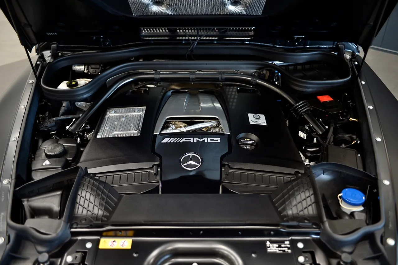 เพชรเม็ดงามของ AMG G63 คือเครื่องยนต์ V8 เทอร์โบคู่ที่ผ่านการเจียระไนแล้วประกอบด้วยมือจากช่างเครื่องยนต์สุดเก๋าใน affalterbach กำลัง 585 แรงม้า แรงบิด 850 นิวตันเมตร (627 ปอนด์-ฟุต) ระบบเกียร์อัตโนมัติ AMG SPEEDSHIFT TCT 9-SPEED SPORTS TRANSMISSION พ่วงด้วยชุดขับสี่ 4Matic + จัดสปีดที่รวดเร็ว ส่งกำลังไปยังล้อทั้งสี่ โดยแยกอัตราส่วนการกระจายแรงบิดหน้า/หลัง ที่ 60/40 ภายใต้สภาวการณ์ปกติ เครื่องยนต์ไซส์ใหญ่ที่กำลังจะสูญพันธุ์ของ AMG เร่งความเร็วจาก 0 ถึง 100 กม./ชม. ในเวลาเพียงแค่ 4.5 วินาที เป็นคาบเวลาที่ดุเดือดเลือดพล่านบนมวลน้ำหนัก 2,650 กิโลกรัม ที่เคลื่อนไหวอย่างว่องไวบนผิวทางที่เสี่ยงต่อการลื่นไถล นำ้หนักของ G63 มากกว่า Mercedes-Benz GLB-Class เกือบ 1,000 กิโลกรัม โดยมีแนวโน้มว่าค่าสัมประสิทธิ์แรงเสียดทานของ G-Class รุ่นเรือธงนั้นมีตัวเลขแอโรไดนามิกอยู่ในเกณฑ์ย่ำแย่ที่สุดในกลุ่มซุปเปอร์เอสยูวี แต่นี่คือชัยชนะทางวิศวกรรมยานยนต์ที่พยายามฉีกกฎเกณฑ์ทางฟิสิกส์ ชัดเจนว่า Porsche 911/992 รุ่นพื้นฐาน ใช้เวลา 4.2 วินาที เพื่อเร่งความเร็วจาก 0 ถึง 100 กม./ชม. โดยมีค่าสัมประสิทธิ์แรงเสียดทานอากาศที่ 0.29 และมีน้ำหนักประมาณ 1.6 ตัน ส่วน G63 มีค่าสัมประสิทธิ์แรงเสียดทานอากาศที่ 0.55 และมีน้ำหนักตัว 2.6 ตัน ทั้งต้านลมและตัวหนักกว่า 1 ตัน แต่วิ่ง 0-100 ช้ากว่า 911/992 แค่ 0.3 วินาที G-Wagen 63 ติดตั้งเฟืองท้าย limited slip differential ล็อกเฟืองท้ายได้สามรูปแบบ ด้วยความเร็วที่เหมาะสมบวกกับประสิทธิภาพของยางและระบบรองรับกับซอฟต์แวร์รักษาเสถียรภาพ