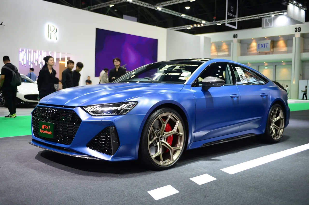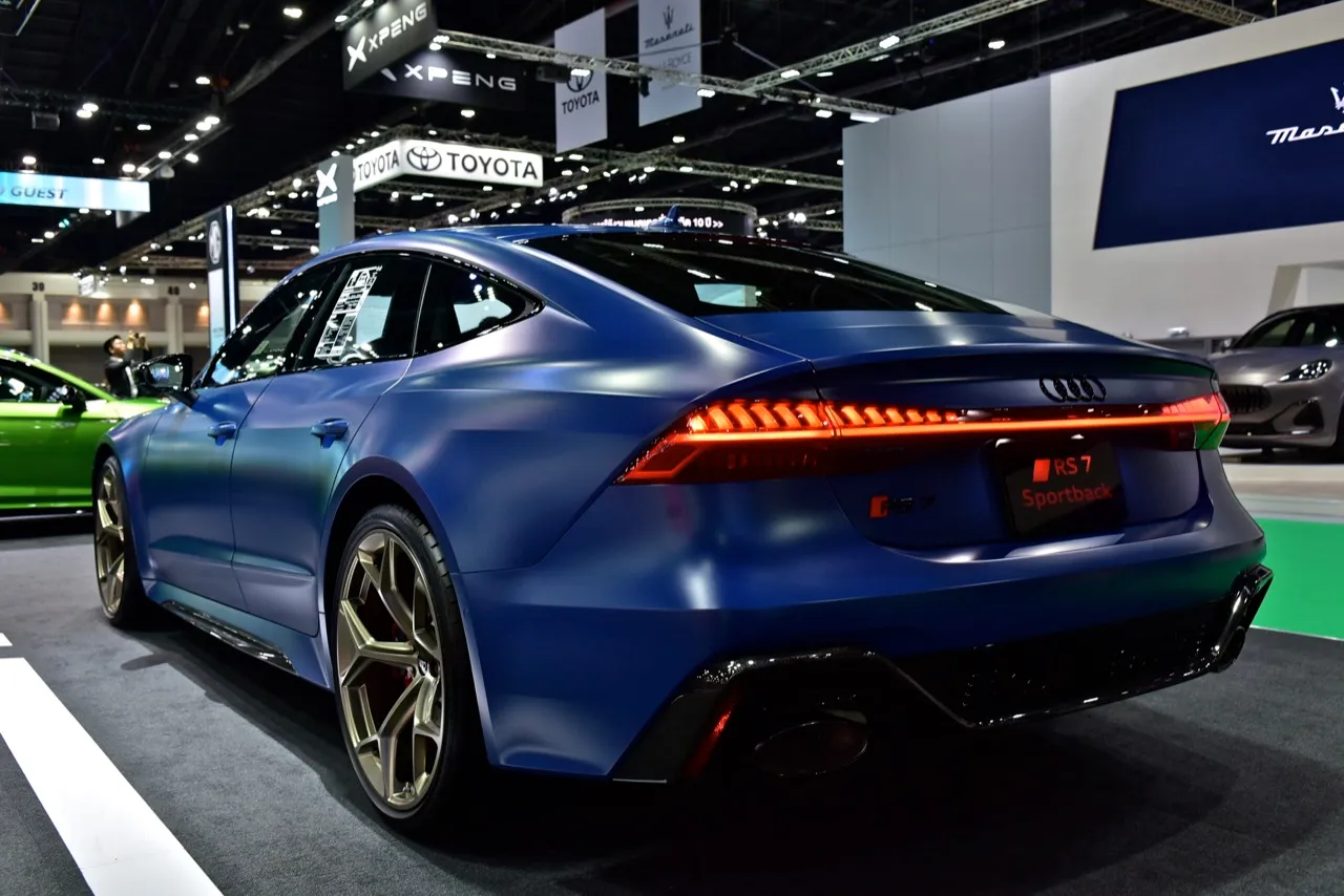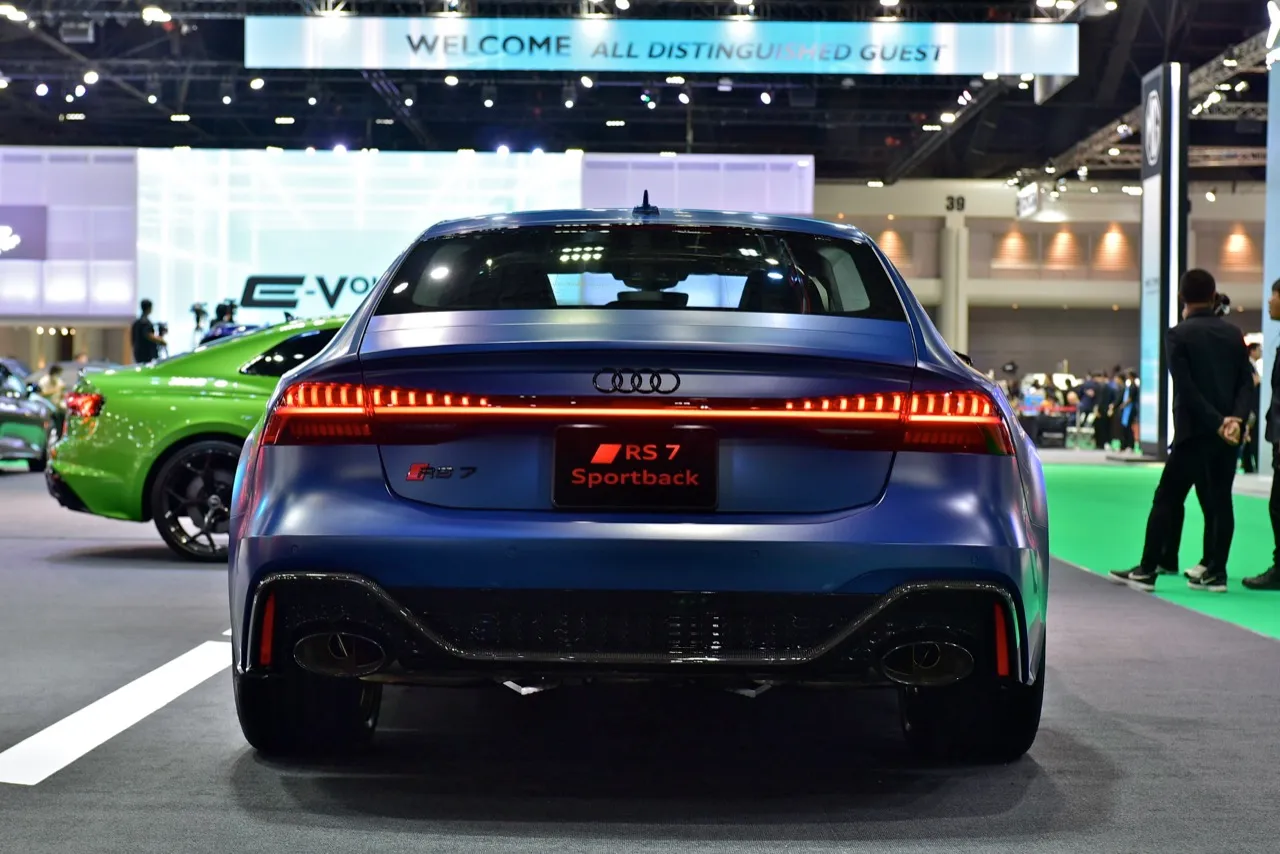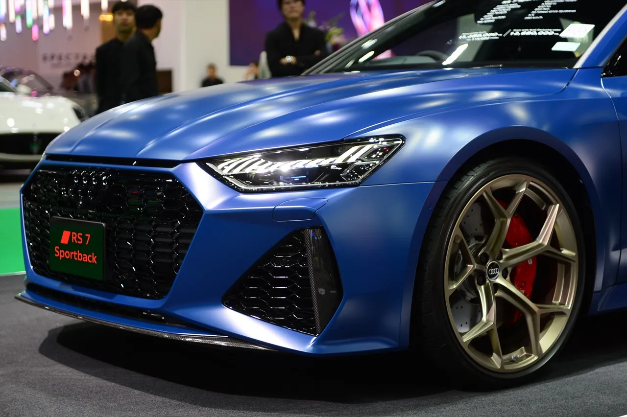 Audi จัดแสดง RS 7 Sportback Quattro ด้วยสีตัวถังพิเศษ Ascari Blue พร้อมอุปกรณ์ตกแต่งคาร์บอนไฟเบอร์รอบคัน สำหรับ RS 7 Sportback Quattro รถแกรนด์ทัวริ่งสุดสวย เป็นคู่แข่งของ Mercedes-AMG E63 และ BMW M850i Gran Coupe และพิเศษกว่าที่เคย เป็นครั้งแรกที่ Audi Sport นำเสนอ Sportcoupé ที่มาพร้อมสีตัวถังสั่งทำพิเศษ ระบบส่งกำลังประสิทธิภาพสูง ช่วงล่างแบบสปอร์ต ล้อลายใหม่ขอบ 22 นิ้ว ชุดขับเคลื่อน Quattro เวอร์ชัน Sport RS ระบบบังคับเลี้ยวสี่ล้อ four-wheel steering และเฟืองขับเคลื่อน Sport Differential เพื่อต่อกรกับคู่แข่งร่วมสัญชาติเยอรมันในกลุ่มลักชัวรี่สปอร์ตซาลูน