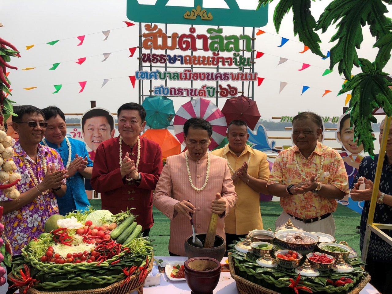 ทั้งนี้ ได้มีการเปิดถนนเลียบฝั่งแม่น้ำโขง ในเขตเทศบาลเมืองนครพนม เชิญชวนประชาชน นักท่องเที่ยว มาเล่นน้ำสงกรานต์ พร้อมจัดซุ้มวิถีชีวิต วัฒนธรรมประเพณีท้องถิ่น ให้ชื่นชมควบคู่ไปด้วย ส่วนในการเปิดงาน มีการสร้างสีสัน ในการตำส้มตำ การบีบข้าวปุ้นสด หรือขนมจีน เมนูอาหารอีสานขึ้นชื่อ ของ จ.นครพนม ที่เป็นภูมิปัญญาชาวบ้าน สร้างรายได้ ให้กับประชาชนมาแต่โบราณ จึงนำมาเป็นสัญลักษณ์ ชื่อของการจัดงานสงกรานต์ทุกปี พร้อมเชิญชวนประชาชน นักท่องเที่ยว รับประทานเมนูข้าวปุ้นฟรี รวมถึงการแสดงโชว์ส้มตำลีลา
