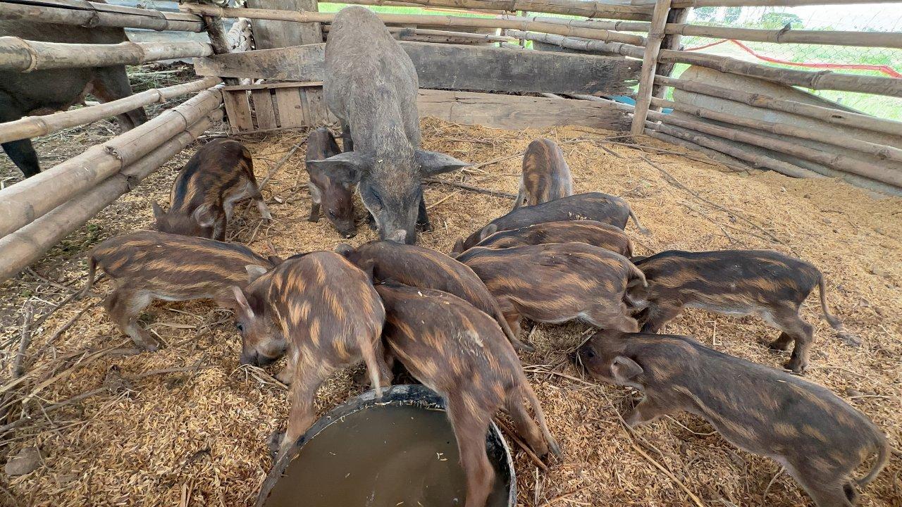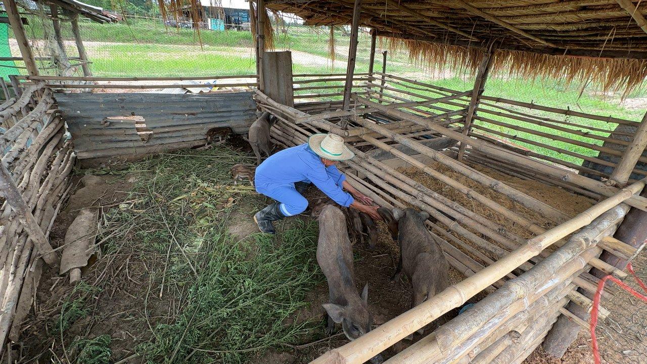 นายยติพงษ์ ชานนท์ อายุ 48 ปี เจ้าของฟาร์ม ที่กำลังดูแลลูกหมูป่าที่มีลายสีน้ำตาลสลับกับสีดำ อายุเดือนกว่า ทั้งหมด 12 ตัว ที่วิ่งวนเวียนกินอาหารไปมาอยู่กับแม่หมูจำนวน 3 ตัว ซึ่งในฟาร์มดังกล่าวมีการแบ่งคอกแยกแม่หมูป่า3 ตัว กับลูก 12 ตัว ออกจากหมูป่าเพศผู้และเพศเมีย จำนวน 7 ตัว เพราะถ้าขังไว้ด้วยกันหมูป่าตัวใหญ่จะกัดหมูป่าตัวเล็ก จึงต้องแยกขัง โดยในคอกมีทั้งใบกระถินและต้นกล้วย ใบกล้วย ที่เจ้าของฟาร์มานำมาให้หมูป่ากิน