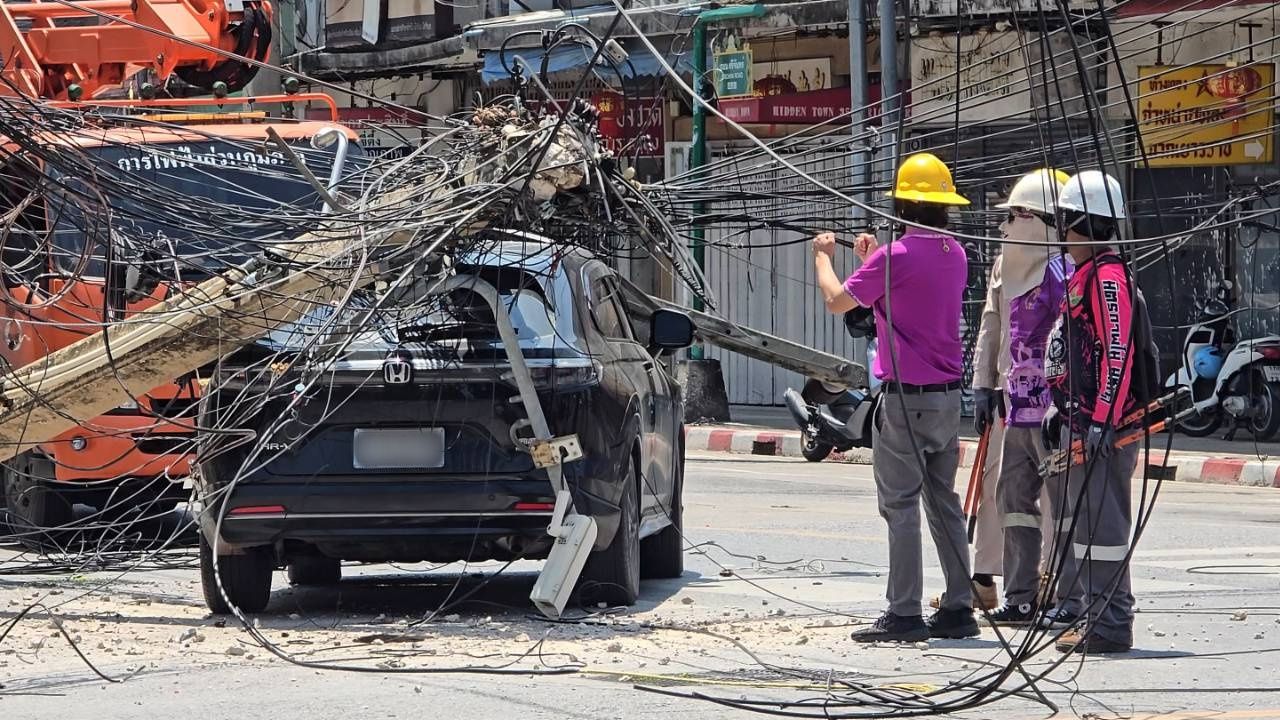 ระทึกกลางเมืองขอนแก่น รถเทรลเลอร์บรรทุกแบ็กโฮ เกี่ยว "สายไฟฟ้า" ทำเสาหักโค่นล้มทับเก๋ง 2 หนุ่ม รอดหวุดหวิด