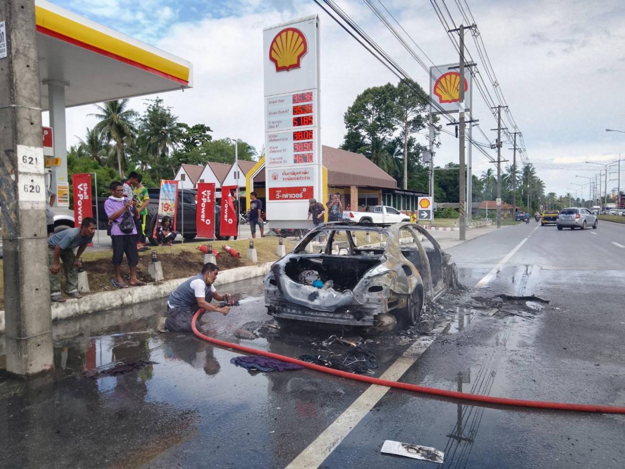 เมื่อไปถึงบริเวณริมถนนหน้าปั๊มน้ำมันพบเพลิงกำลังโหมลุกไหม้รถยนต์ ยี่ห้อเบนซ์ สีขาว รุ่น C350E ทะเบียน ฐก-8868 กทม. จนไม่สามาถดับได้ทัน โดยพบว่าคนขับได้วิ่งหนีรอดออกจากรถมาได้หวุดหวิด ไม่ได้รับบาดเจ็บแต่อย่างใด และเพลิงได้ลุกไหม้รถเบนซ์คันดังกล่าวจนวอดหมดทั้งคันอย่างรวดเร็ว ก่อนที่รถดับเพลิงจะเข้าทำการดับไฟสงบลงในที่สุด ใช้เวลาประมาณ 15 นาที ส่วนนายภาณุมาศ พันธุ์งาม อายุ 34 ปี คนขับรถเบนซ์ที่วิ่งหนีออกจากรถได้ยืนดูสภาพรถของตัวเองที่ถูกไฟไหม้จนเหลือแต่ซากเหล็กอย่างเสียดาย สำหรับมูลค่าความเสียหายรถเบนซ์ทั้งคันประมาณ 2.7 ล้านบาท