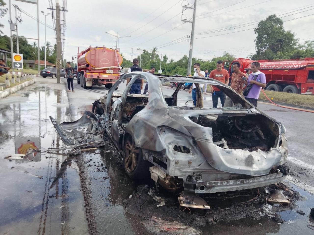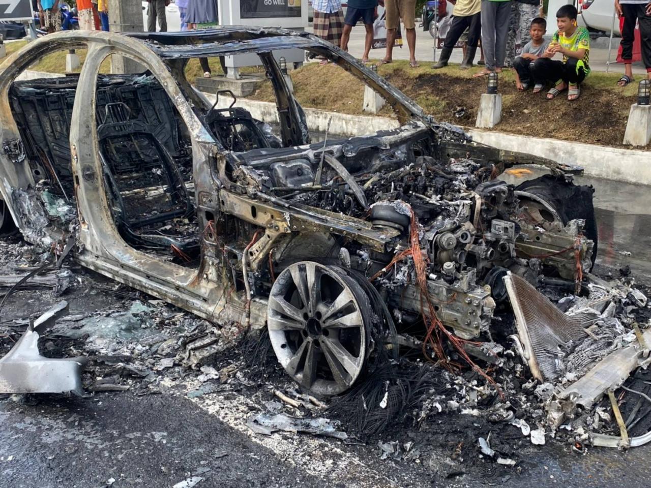 ระทึก หนุ่มค้าบ้านจัดสรร หนีตายโดดออกจากเบนซ์หรู หลังรถวิ่งไปเหยียบแผ่นเหล็กกลางถนน แล้วระบบไฟในรถโชว์ ก่อนที่ไฟจะลุกไหม้ห้องเครื่องจนวอดทั้งคัน กลายเป็นซากรถ