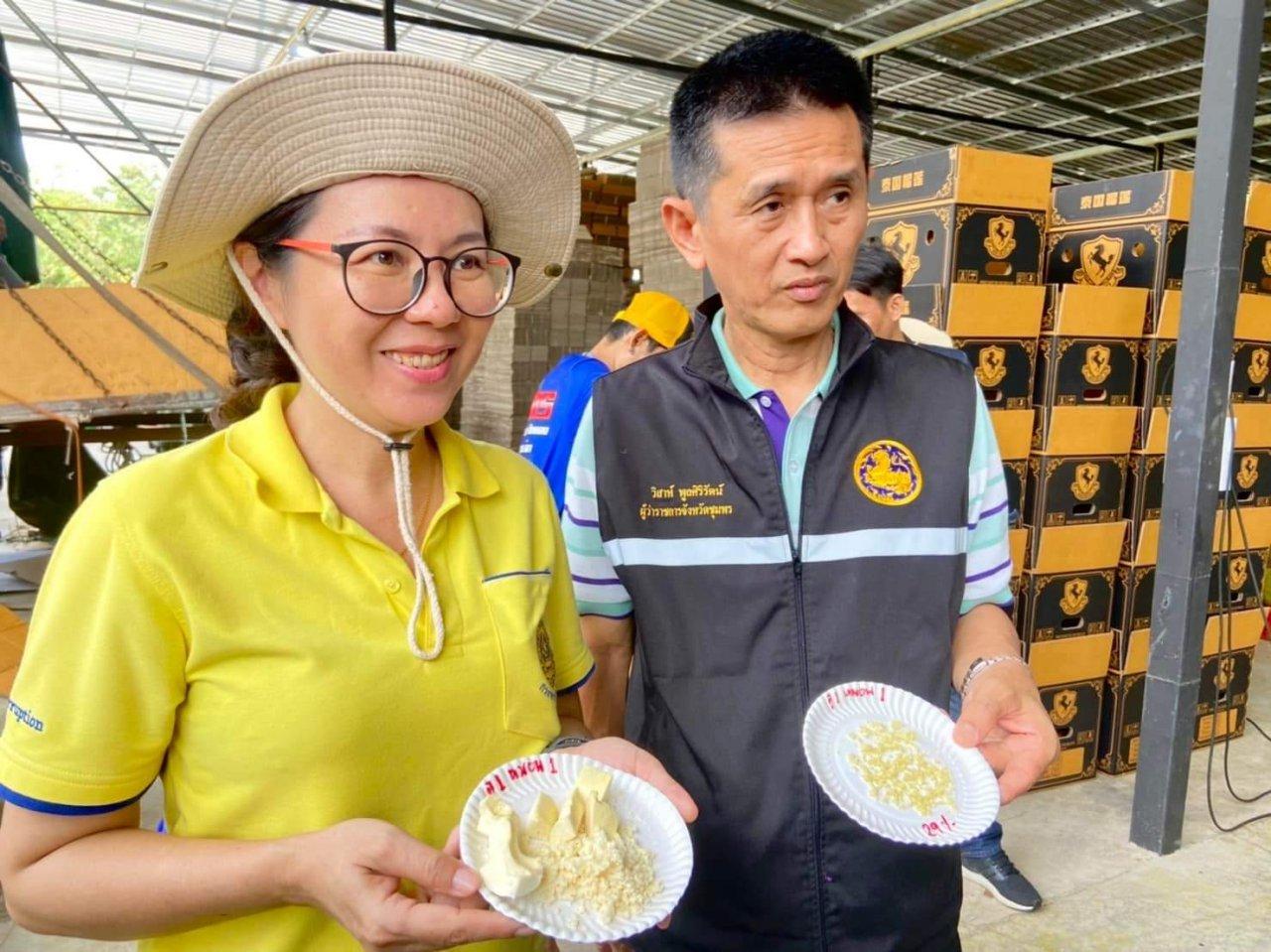 ผู้ว่าฯ ชุมพร บูรณาการ จนท.ตรวจเข้มล้ง-แผงทุเรียนจากสถานประกอบการ 5 แห่งใน อ.ทุ่งตะโก และ อ.หลังสวน พบมีการนำทุเรียนด้อยคุณภาพจากต่างจังหวัดเข้ามาขาย จึงทำสัญลักษณ์ป้องกันนำไปขายปะปนกับทุเรียนคุณภาพ