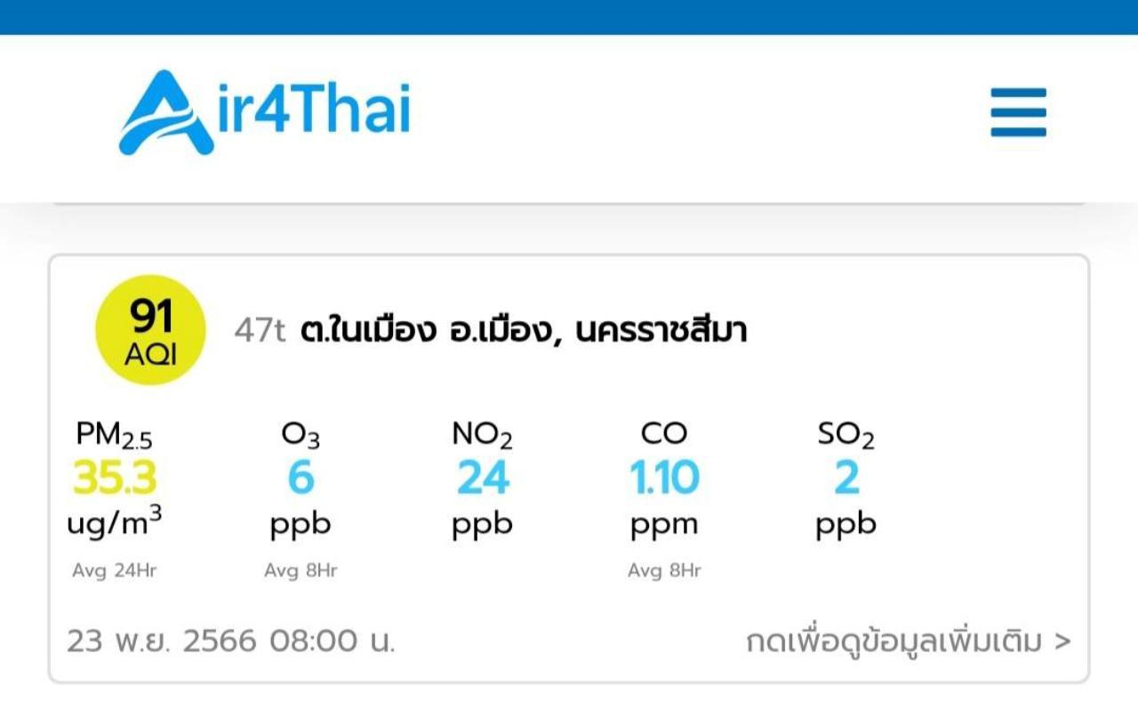 อย่างไรก็ตาม แม้ว่าแอปพลิเคชัน Air 4 Thai จะตรวจวัดดัชนีคุณภาพอากาศในพื้นที่ ต.ในเมือง อ.เมืองนครราชสีมา จ.นครราชสีมา วันนี้ (23 พฤศจิกายน 2566) โดยระบุว่า ดัชนีคุณภาพอากาศอยู่ในเกณฑ์ปานกลาง สีเหลือง ตรวจวัดค่าได้ 91 AQI และปริมาณฝุ่น PM 2.5 ในอากาศจะอยู่ที่ 35.3 ไมโครกรัมต่อลูกบาศก์เมตร ก็ตาม แต่หากยังคงลักลอบเผาอย่างต่อเนื่องต่อไป สำนักงานสิ่งแวดล้อมและควบคุมมลพิษที่ 11 นครราชสีมา ก็คาดการณ์ว่า ค่าดัชนีคุณภาพอากาศจะพุ่งสูงขึ้นเกินมาตรฐาน 50 ไมโครกรัมต่อลูกบาศก์เมตร จนส่งผลกระทบต่อสุขภาพของประชาชนอย่างแน่นอน จึงขอให้ประชาชนและเกษตรกรได้ให้ความร่วมมืองดเผาขยะริมทาง และงดเผาซากพืชผลทางการเกษตรด้วย เพื่อลดมลพิษทางอากาศและป้องกันไม่ให้เกิดความเสียหายอื่นๆ ตามมา .