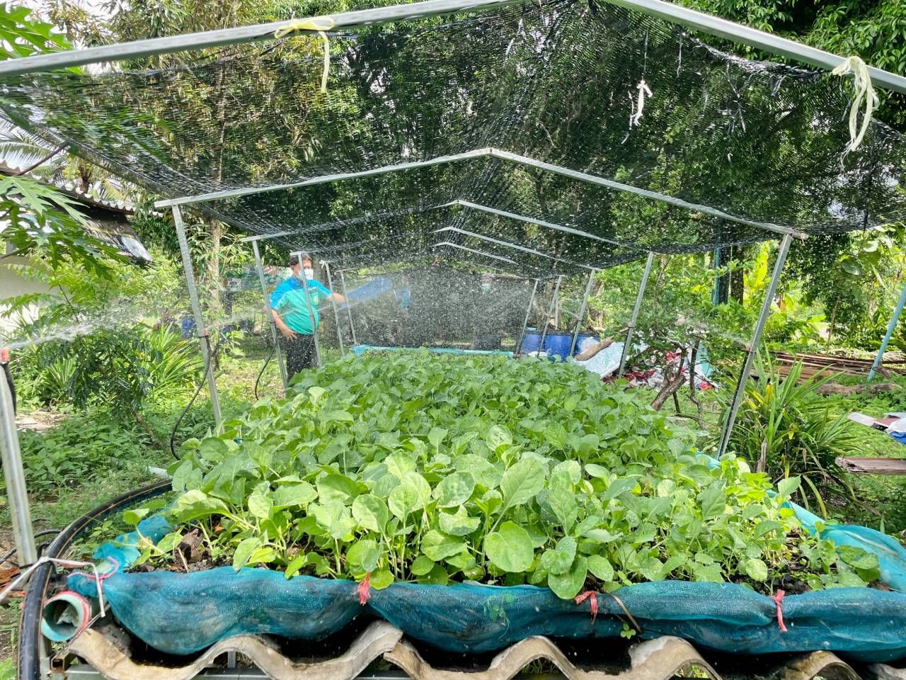 4. การจัดการแปลงปลูกด้วยการคลุมแปลง เพื่อป้องกันเม็ดฝนที่สร้างความเสียหายแก่ผิวหน้าดินและระบบรากพืช โดยเฉพาะพืชที่มีระบบรากตื้น โดยใช้วัสดุเหลือใช้ที่หาได้ง่าย เช่น ฟางข้าว หญ้าแห้ง หรือสแลนตาข่ายพรางแสง หรือทำหลังคาจะช่วยป้องกันและลดความเสียหายของแรงกระทบจากน้ำฝนต่อเมล็ดและต้นอ่อนได้