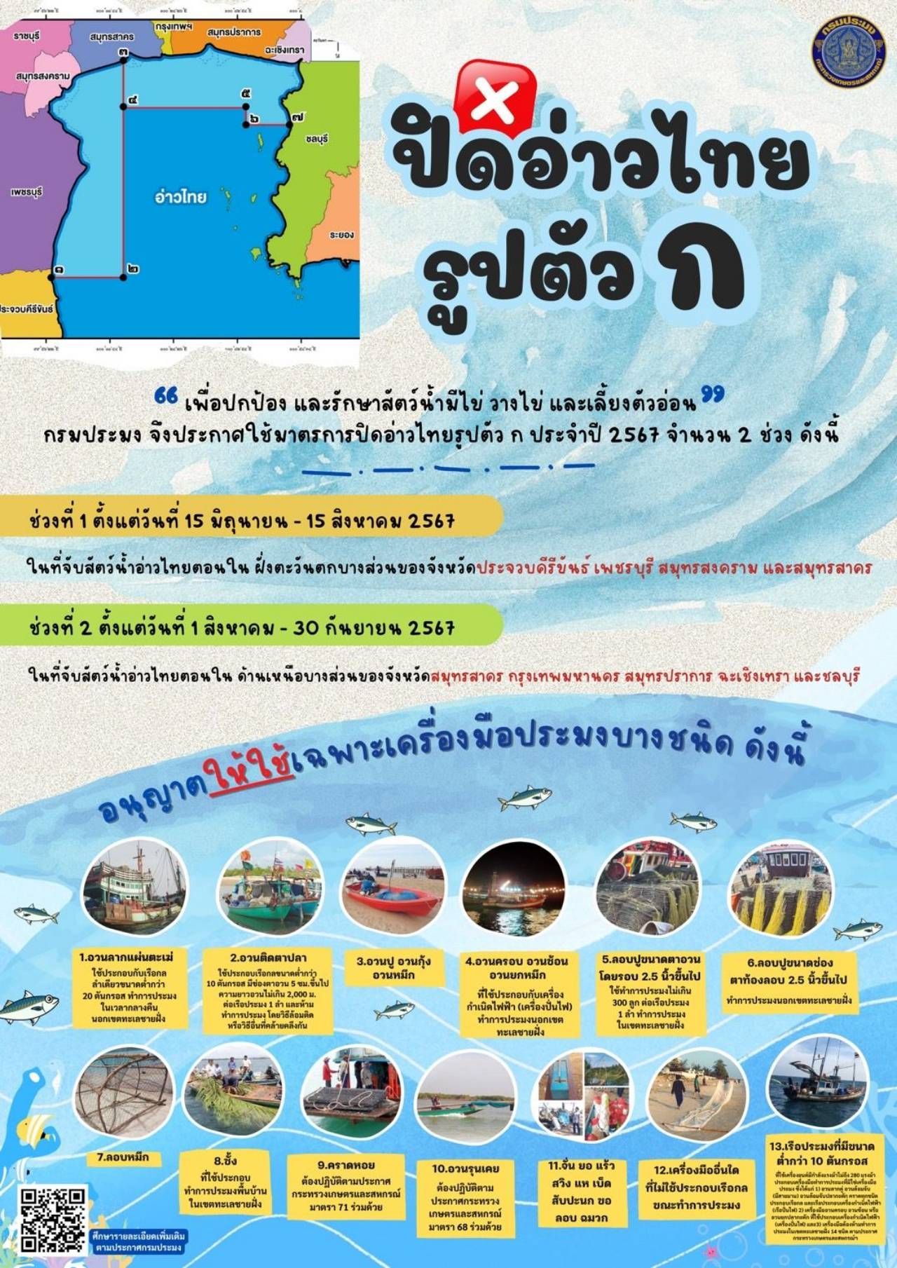 นายบัญชา สุขแก้ว อธิบดีกรมประมง กล่าวว่า กรมประมงประกาศใช้มาตรการปิดอ่าวไทยรูปตัว ก ประจำปี 2567 เพื่อฟื้นฟูและบริหารจัดการทรัพยากรสัตว์น้ำ ด้วยการปกป้องและคุ้มครองให้สัตว์น้ำสามารถเจริญเติบโตมีความสมบูรณ์เพศ พร้อมผสมพันธุ์วางไข่เป็นสัตว์น้ำรุ่นต่อไป โดยแบ่งพื้นที่และระยะเวลาในการบังคับใช้มาตรการออกเป็น 2 ช่วง ได้แก่ ช่วงที่ 1 : ตั้งแต่วันที่ 15 มิถุนายน – 15 สิงหาคม 2567 ในพื้นที่จับสัตว์น้ำอ่าวไทยตอนใน ฝั่งตะวันตก บางส่วนของจังหวัดประจวบคีรีขันธ์ เพชรบุรี สมุทรสงคราม และสมุทรสาคร โดยเริ่มจากอำเภอหัวหิน จังหวัดประจวบคีรีขันธ์ และสิ้นสุดที่อำเภอเมือง จังหวัดสมุทรสาคร และ ช่วงที่ 2 : ตั้งแต่ วันที่ 1 สิงหาคม – 30 กันยายน 2567 ในพื้นที่จับสัตว์น้ำอ่าวไทยตอนใน ด้านเหนือ บางส่วนของจังหวัดสมุทรสาคร กรุงเทพมหานคร สมุทรปราการ ฉะเชิงเทรา และชลบุรี โดยเริ่มจากอำเภอเมือง จังหวัดสมุทรสาคร และสิ้นสุดที่อำเภอศรีราชา จังหวัดชลบุรี
