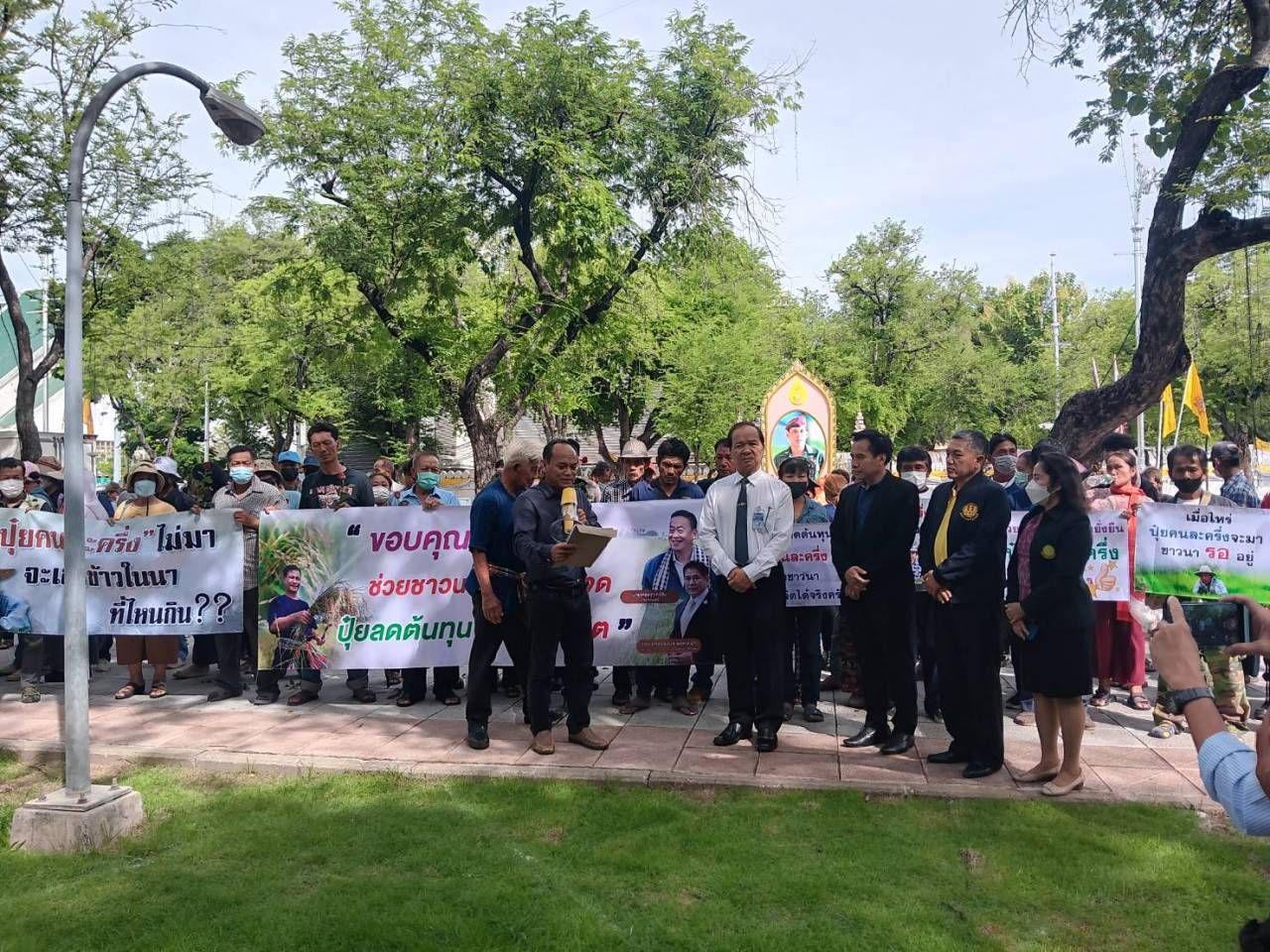 จากนั้นเมื่อเวลา 09.00 น. แกนนำกล่าวผ่านเครื่องขยายเสียงขนาดเล็ก กล่าวสนับสนุนและขอบคุณนายกฯ ที่ให้ความช่วยเหลือชาวนาผ่านโครงการปุ๋ยคนละครึ่ง มวลชนร่วมกันชูป้ายข้อความ ได้แก่ ข้อความ "ขอบคุณท่านนายกฯ ช่วยชาวนาได้ถูกที่ถูกจุด ปุ๋ยลดต้นทุนเพิ่มผลผลิต", "ท่านนายกจ๋า ชาวนารอปุ๋ยคนละครึ่ง", "ฟังเสียงชาวนาแล้วจะรู้ว่าอยากได้ ปุ๋ยคนละครึ่ง", "เมื่อไหร่ปุ๋ยคนละครึ่งจะมา ชาวนารออยู่" และ "คนละครึ่งไม่มา จะเอาข้าวในนาที่ไหนกิน"
