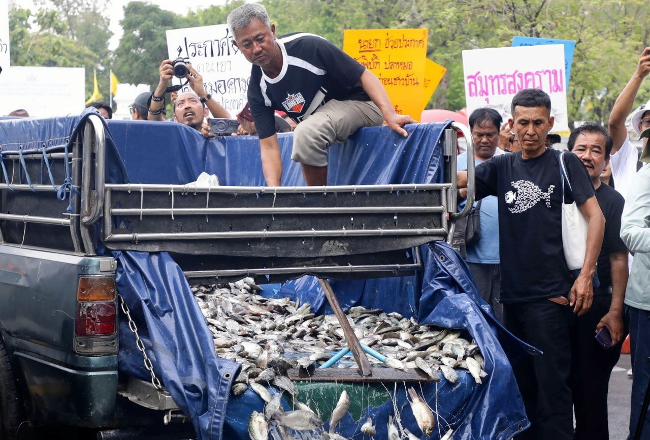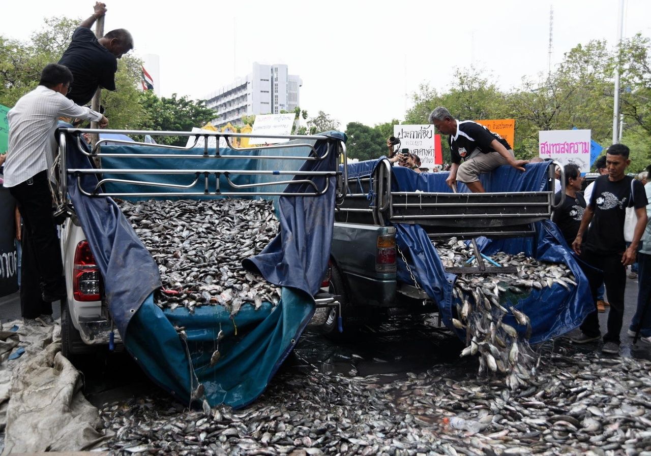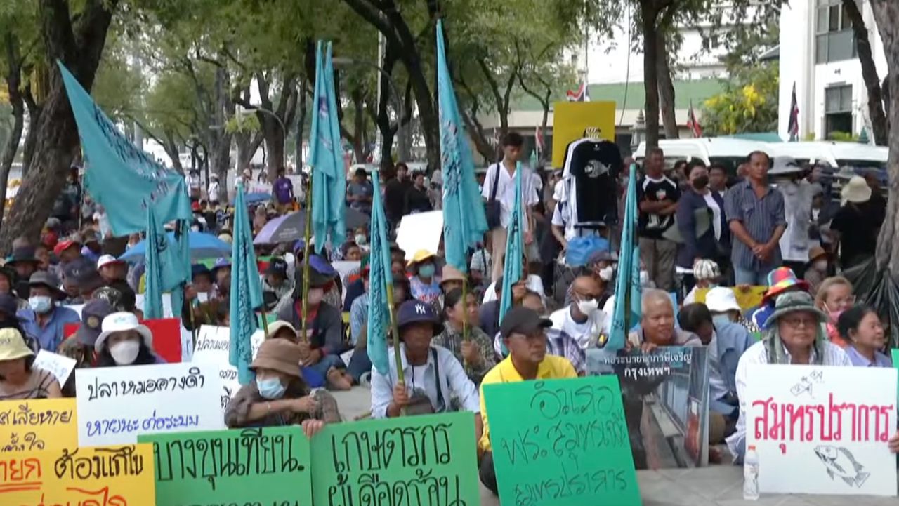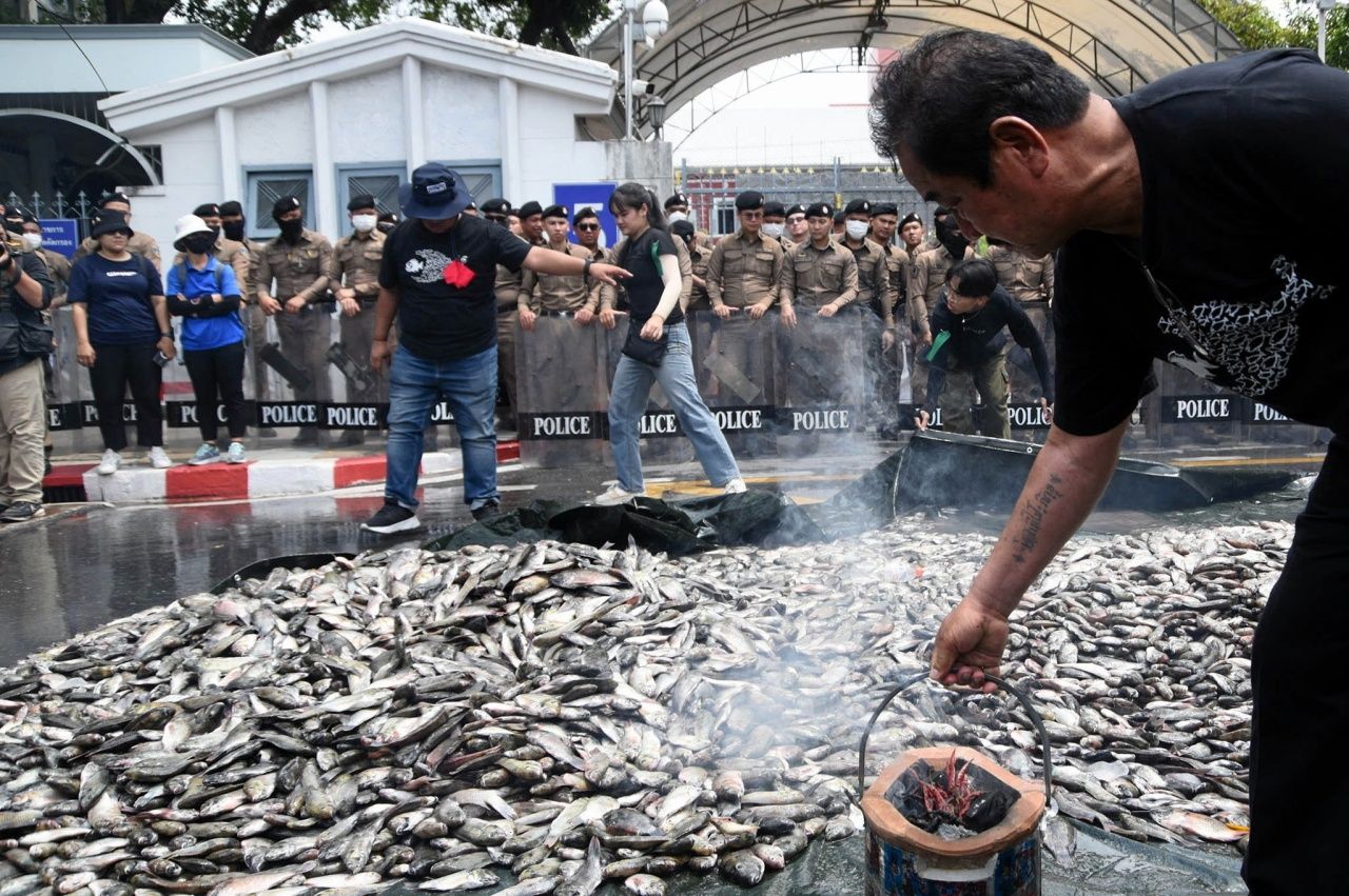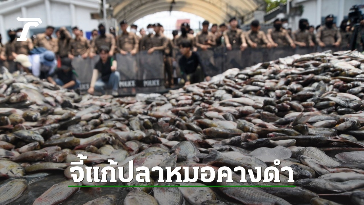 ผู้ชุมนุม เครือข่ายประชาชน 19 จังหวัด บุกทำเนียบฯ ทวงถาม 4 ข้อเรียกร้องการจัดการ "ปลาหมอคางดำ" พร้อมเทปลา 2 ตัน จุดเตาเผาพริกเผาเกลือ แสดงออกเชิงสัญลักษณ์