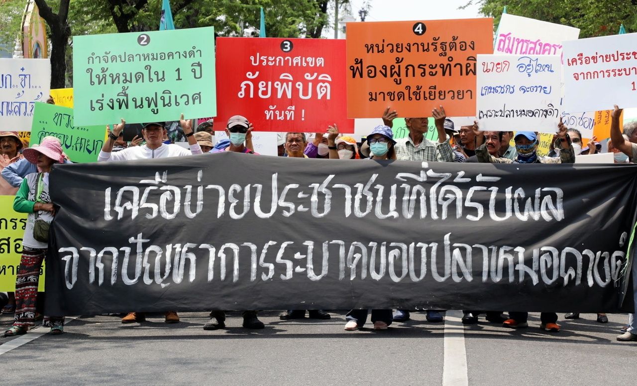 เมื่อเวลา 10.00 น. วันที่ 18 มี.ค. 2568 ผู้สื่อข่าวรายงานว่า บริเวณหน้ากระทรวงเกษตรและสหกรณ์ เครือข่ายประชาชน 19 จังหวัด ที่ได้รับผลกระทบจากปลาหมอคางดำ นัดรวมตัวกันเพื่อเตรียมที่จะเคลื่อนขบวนไปยังทำเนียบรัฐบาล เพื่อทวงถามข้อเรียกร้อง 4 ข้อเกี่ยวกับการจัดการปลาหมอคางดำ ที่ได้ยื่นถึงรัฐบาลไปแล้วเมื่อวันที่ 13 ม.ค.ที่ผ่านมา คือ 1. ตั้งคณะกรรมการอิสระตรวจสอบหาผู้กระทำความผิด 2. กำจัดปลาหมอคางดำให้หมดภายใน 1 ปี และเร่งฟื้นฟูระบบนิเวศ 3. ประกาศเขตภัยพิบัติทันที และ 4. ให้หน่วยงานรัฐฟ้องผู้กระทำความผิดมาชดใช้เยียวยา
