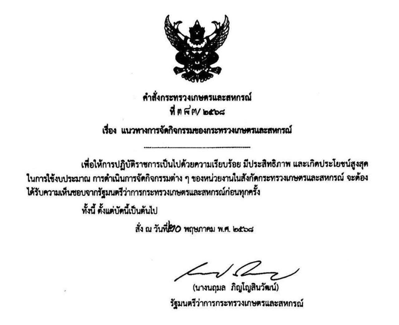 ทั้งนี้ เพื่อให้การปฏิบัติราชการเป็นไปด้วยความเรียบร้อย มีประสิทธิภาพและเกิดประโยชน์สูงสุดในการใช้งบประมาณ การดำเนินการจัดกิจกรรมต่างๆ ของหน่วยงานในสังกัดกระทรวงเกษตรและสหกรณ์ จะต้องได้รับความเห็นชอบจากรัฐมนตรีว่าการกระทรวงเกษตรและสหกรณ์ก่อนทุกครั้ง ทั้งนี้ ตั้งแต่บัดนี้เป็นต้นไป