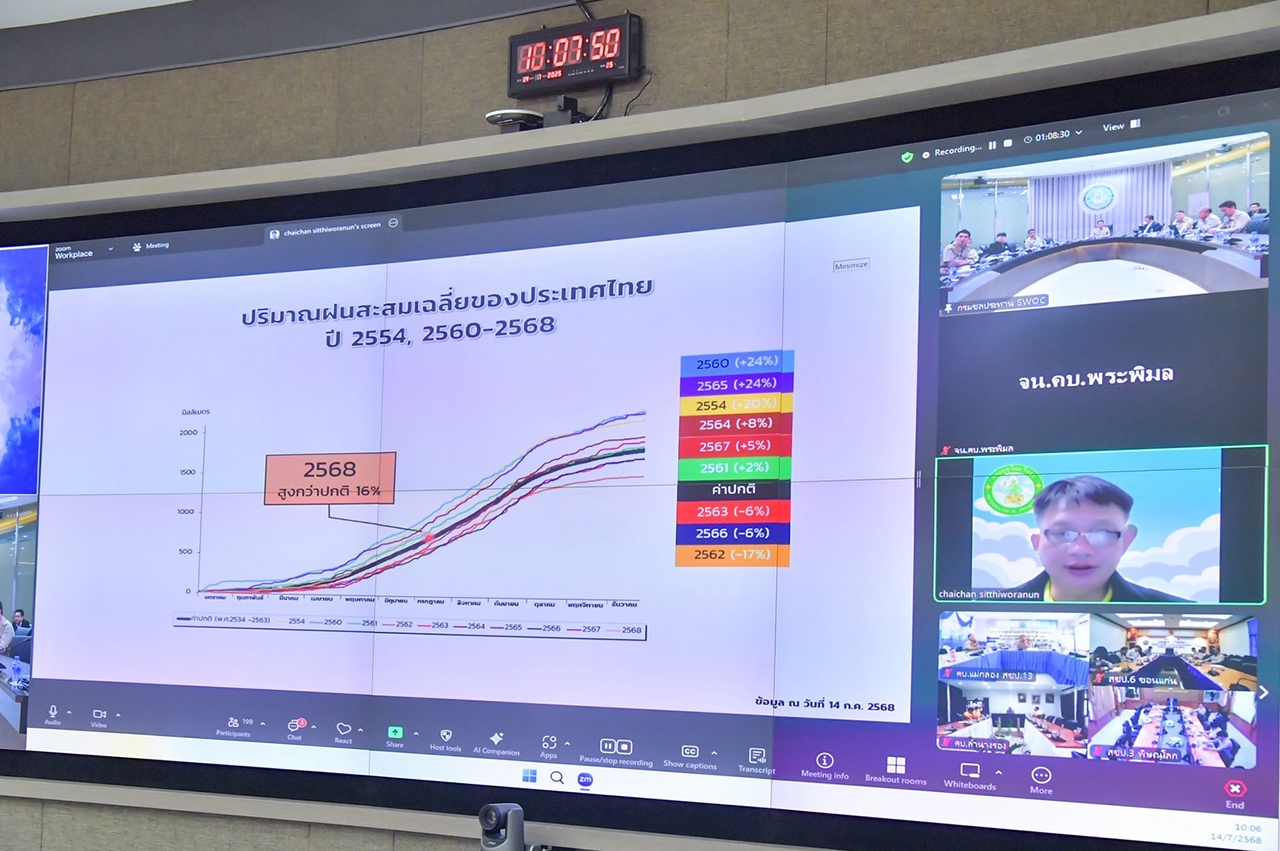 วันที่ 14 ก.ค. 68 ณ ห้องประชุมศูนย์ปฏิบัติการน้ำอัจฉริยะ (SWOC) อาคาร 99 ปี หม่อมหลวงชูชาติ กำภู กรมชลประทาน ถนนสามเสน นายเดช เล็กวิชัย รองอธิบดีกรมชลประทาน เป็นประธานการประชุมคณะอนุกรรมการติดตามและวิเคราะห์แนวโน้มสถานการณ์น้ำ โดยมีหน่วยงานที่เกี่ยวข้อง อาทิ กรมอุตุนิยมวิทยา กรมทรัพยากรน้ำ กรมป้องกันและบรรเทาสาธารณภัย และการไฟฟ้าฝ่ายผลิตแห่งประเทศไทย ตลอดจนสำนักงานชลประทานที่ 1-17 และเจ้าหน้าที่ผู้เกี่ยวข้อง เข้าร่วมประชุม เพื่อติดตามและวิเคราะห์แนวโน้มสภาพอากาศ สถานการณ์น้ำในอ่างเก็บน้ำ แม่น้ำสายหลักต่าง ๆ สำหรับเป็นข้อมูลในการบริหารจัดการน้ำในช่วงฤดูฝน ให้เกิดประสิทธิภาพสูงสุด