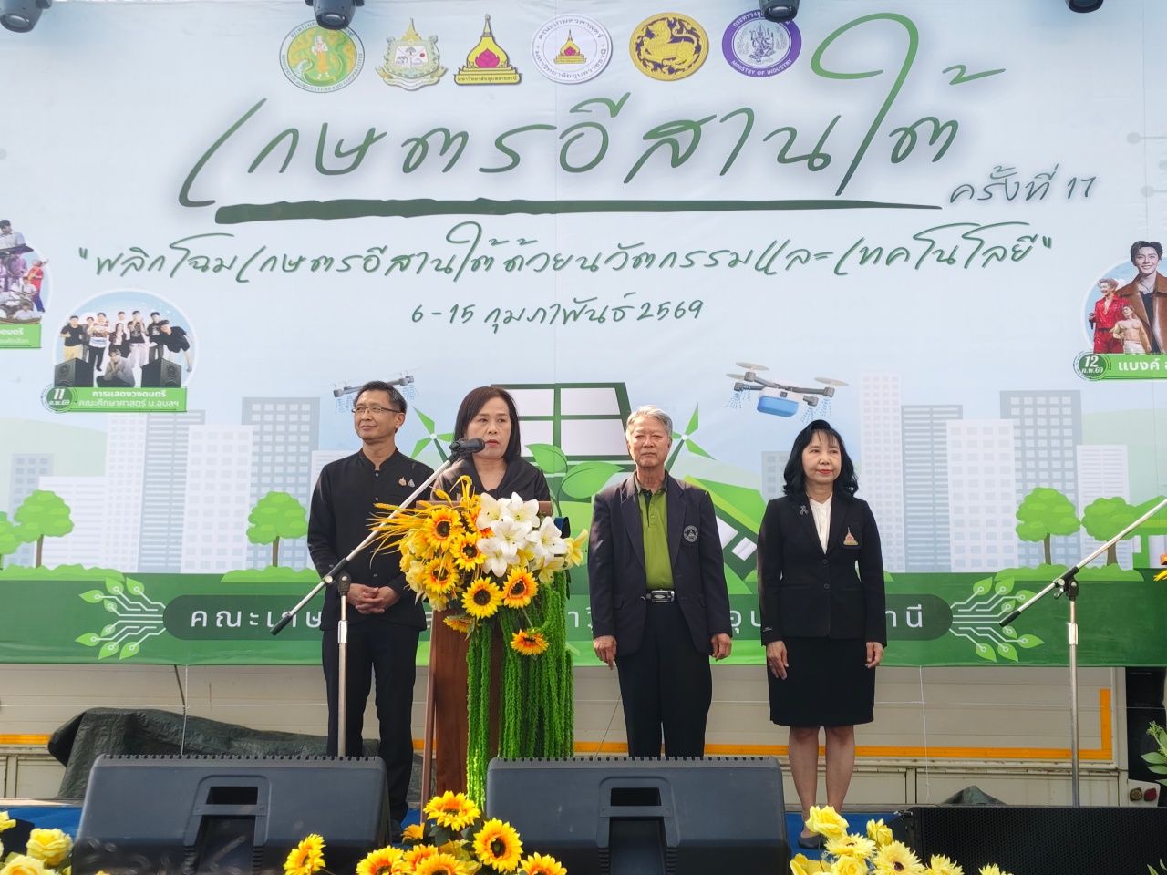 วันที่ 6 ก.พ. 2569 ผู้สื่อข่าวรายงานว่า บริเวณลานกิจกรรม คณะเกษตรศาสตร์ มหาวิทยาลัยอุบลราชธานี อ.วารินชำราบ จ.อุบลราชธานี นางสุวรรณี ศรีสุวรรณ์ ผู้ตรวจราชการกระทรวงเกษตรและสหกรณ์ เป็นประธานเปิดงานเกษตรอีสานใต้ประจำปี 2569 “พลิกโฉมเกษตรอีสานใต้ ด้วยนวัตกรรมและเทคโนโลยี” โดยมี นายภูษิต น้อยโสภากุล รองผู้ว่าราชการจังหวัดอุบลราชธานี รองศาสตราจารย์ ดร.ชุตินันท์ ประสิทธิ์ภูริปรีชา อธิการบดีมหาวิทยาลัยอุบลราชธานี และ ดร.นรินทร บุญพราหมณ์ ดำรงตำแหน่งคณบดีคณะเกษตรศาสตร์ มหาวิทยาลัยอุบลราชธานีให้การต้อนรับ