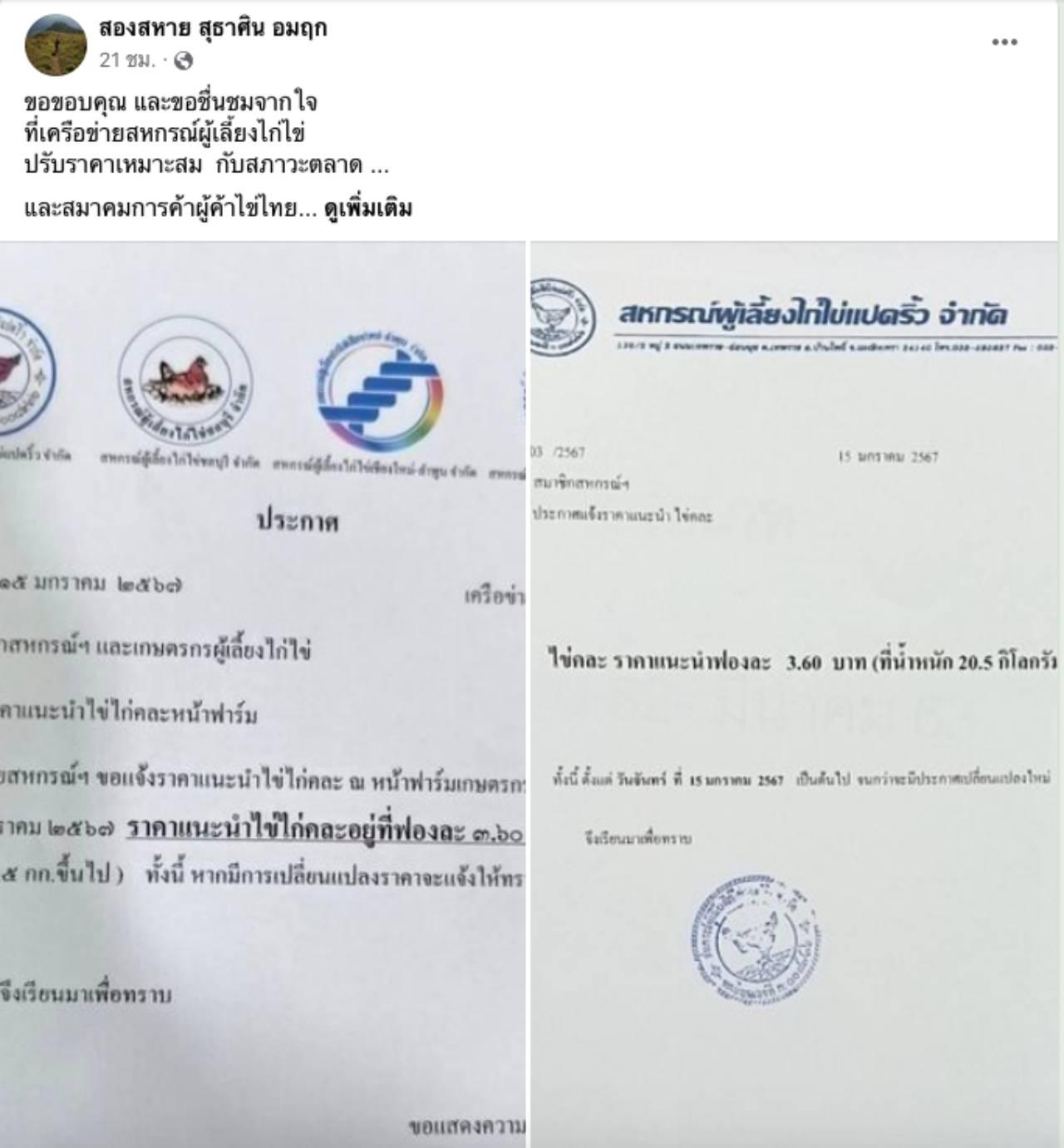 อย่างไรก็ตาม นายสุธาศิน อมฤก นายกสมาคมผู้ค้าไข่ไก่ไทย ได้โพสต์เฟซบุ๊ก พร้อมแนบประกาศล่าสุดของเครือข่ายสหกรณ์ ผู้เลี้ยงไก่ไข่ ที่มีการแจ้งราคาแนะนำใหม่ เมื่อวันที่ 15 ม.ค. 2567 โดยราคาแนะนำไข่ไก่คละอยู่ที่ฟองละ 3.60 บาท โดยลดลงจากประกาศก่อนหน้านี้เมื่อวันที่ 11 ม.ค. 2567 ลงอยู่ 20 นายกสมาคมผู้ค้าไข่ไก่ไทย ขอบคุณและชื่นชมจากใจที่เครือข่ายสหกรณ์ผู้เลี้ยงไก่ไข่ ปรับราคาเหมาะสมกับสภาวะตลาด.