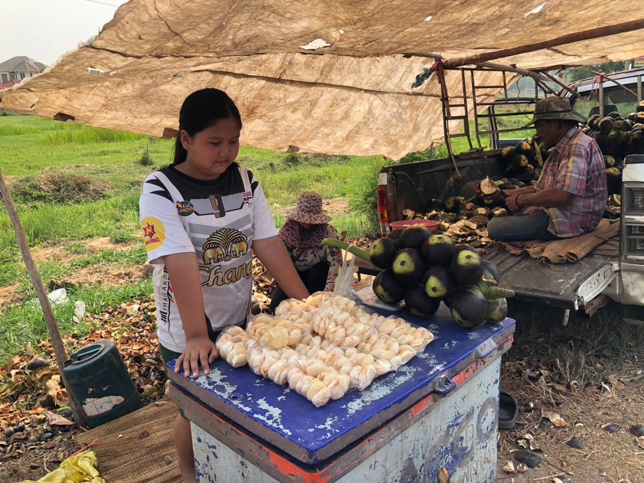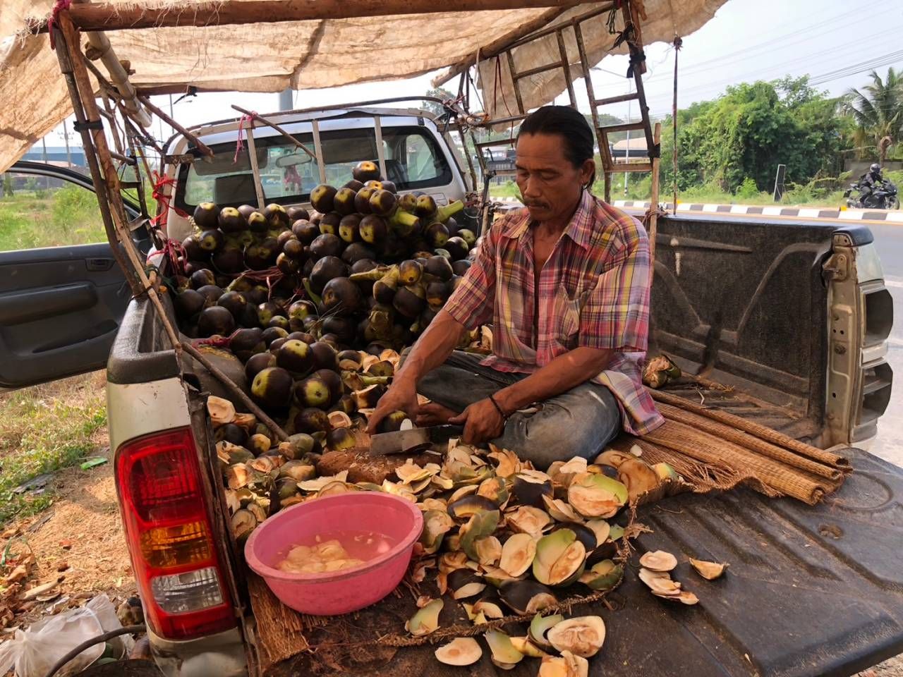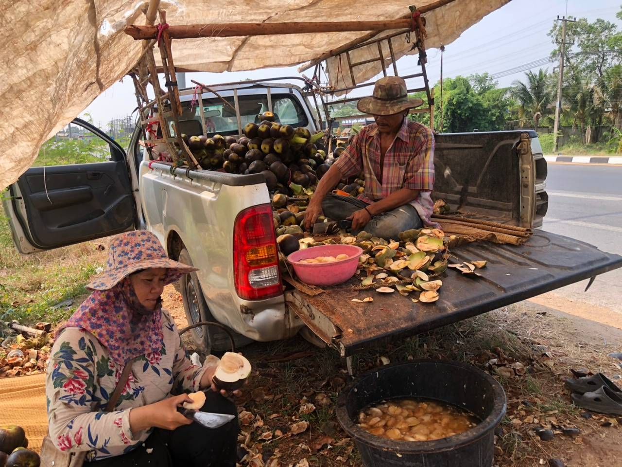 ที่บริเวณริมถนนสายอำเภอเมืองกาฬสินธุ์-อำเภอกมลาไสย บริเวณก่อนถึงบ้านกลางดง ต.ห้วยโพธิ์ อ.เมืองกาฬสินธุ์ เลยสะพานข้ามถนนเลี่ยงเมืองประมาณ 200 เมตร พบสองสามีภรรยาว ต.โพนทอง อ.เมือง จ.กาฬสินธุ์ และลูกสาวที่อยู่ในช่วงปิดเทอม กำลังช่วยกันปอกลูกตาลโตนดสดอ่อน ที่ไปรับซื้อมาจากชาวบ้าน และปีนเก็บตามท้องไร่ท้องนา ก่อนนำขึ้นรถกระบะมาปอกขายให้กับลูกค้าที่ขับรถผ่านไปมา ซึ่งได้รับความสนใจและสามารถสร้างรายได้ในช่วงหน้าแล้งได้เป็นอย่างดี เพราะถือเป็นอาหารตามฤดูกาลอีกอย่างหนึ่ง ที่หารับประทานยาก เพราะ 1 ปีต้นตาลโตนดจะออกผลผลิตแต่ครั้งเดียว และเก็บผลผลิตมาขายได้ในช่วงหน้าแล้งเท่านั้น