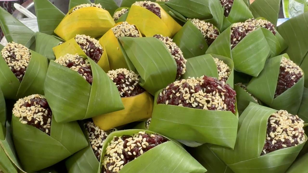 "ข้าวเหนียวดำทำเป็นข้าวต้มมัดไส้กล้วยใส่ถั่วดำ ขายมัดละ 10 บาท ทำมาประมาณ 40 มัด ข้าวต้มมัดข้าวเหนียวแดงขายกลีบละ 5 บาท ทำมาขาย 80 กลีบ ใช้ข้าวเหนียวแต่ละอย่างไม่เกิน 2 กก. ทำออกมาขายแต่ละครั้งก็มีรายได้วันละเกือบ 2,000 บาท" นางนวลจันทร์ กล่าว.