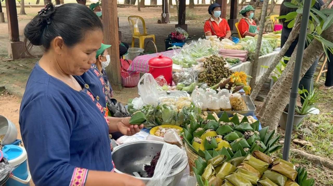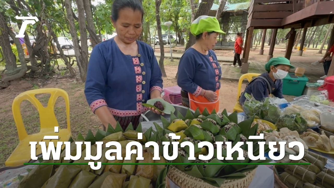 เกษตรกรที่มหาสารคาม แปรรูปข้าวเหนียวต่างๆ มาเป็นขนมเพื่อเพิ่มมูลค่า เพราะขายข้าวสารได้ กก.ละ 60 บาท แต่ถ้ามาทำเป็นข้าวต้มมัดได้ถึง 300 บาท/กก. โดยออกขายตามตลาดหรืองานต่างๆ รายได้วันละเกือบ 2,000 บาท