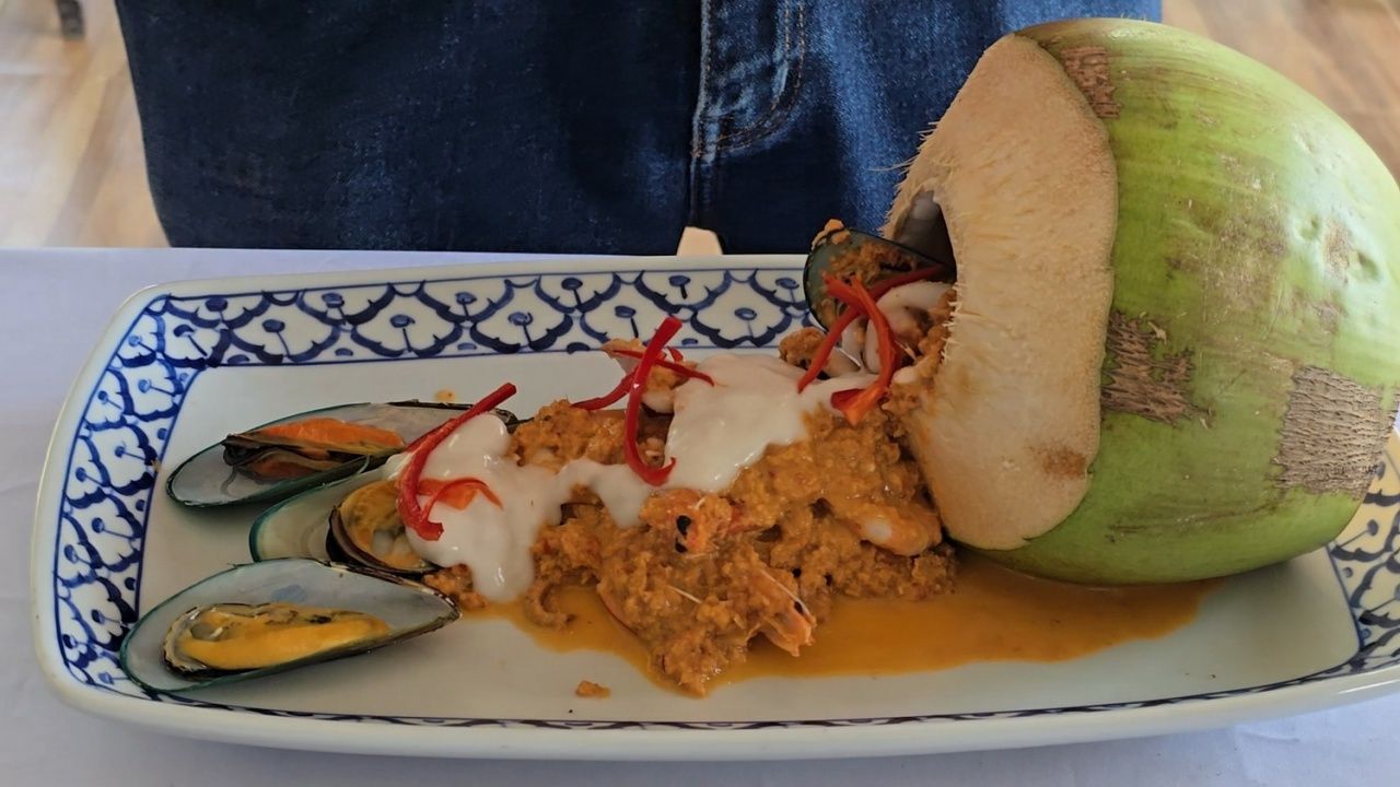 โดยมีนางเป๋า แสงประทุม เจ้าของร้านคุณเป๋า ได้จัดเตรียมเมนูพิเศษที่นำมะพร้าวมาเป็นวัตถุดิบหลัก อาทิ แกงเขียวหวานลูกชิ้นปลาทูมะพร้าวอ่อน, ยำส้มโอปลาทูมะพร้าวอ่อน, ห่อหมกปลาทูมะพร้าวอ่อน, ฉู่ฉี่ทะเลมะพร้าวอ่อนไส้ทะลัก, ขนมต้ม รวมถึงของหวานและของฝากอย่าง พุดดิ้งมะพร้าวอ่อน, กุนเชียงมะพร้าวอ่อน, คุกกี้มะพร้าว, ขนมจาก และไอศกรีมมะพร้าวอ่อน