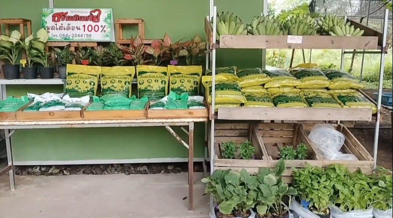 ส่วนพืชผักที่ขายดีที่สุดคือผักกูด ที่เกิดแทบไม่ทัน เพราะแต่ละแปลงจะเก็บได้ครั้งหนึ่งเว้น 2 วัน และมีมะละกอ เพกา (ลิ้นฟ้า) ผักชะอม ตะไคร้ มะกรูด มะนาว ครบเครื่องครัว พืชผักทุกอย่างปลอดสารพิษ พร้อมยังมีพันธุ์พืชอีกหลายชนิด และยังมีดินพร้อมปลูก กับปุ๋ยมูลไส้เดือน ไว้จำหน่ายอีกด้วยในราคาย่อมเยา ทุกวันชาวบ้านจะเก็บผักออกไปขายหน้าตลาด โดยผักที่เก็บมาจากสวน ขายในราคาแบ่งปันเพียง 5–10 บาทเท่านั้น โดยจะเปิดร้านขายตั้งแต่เวลา 7:00 น.-19:00 น. ของทุกวัน.