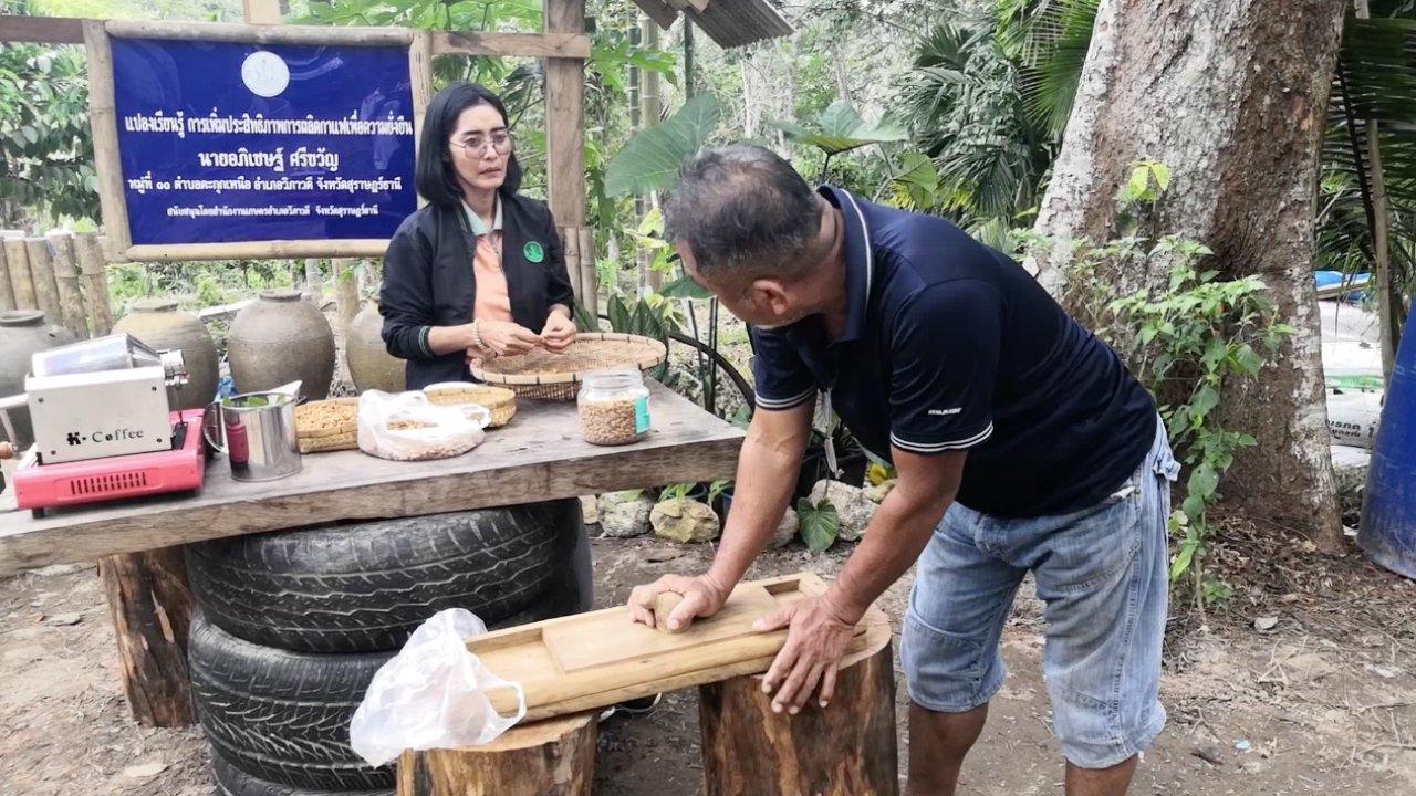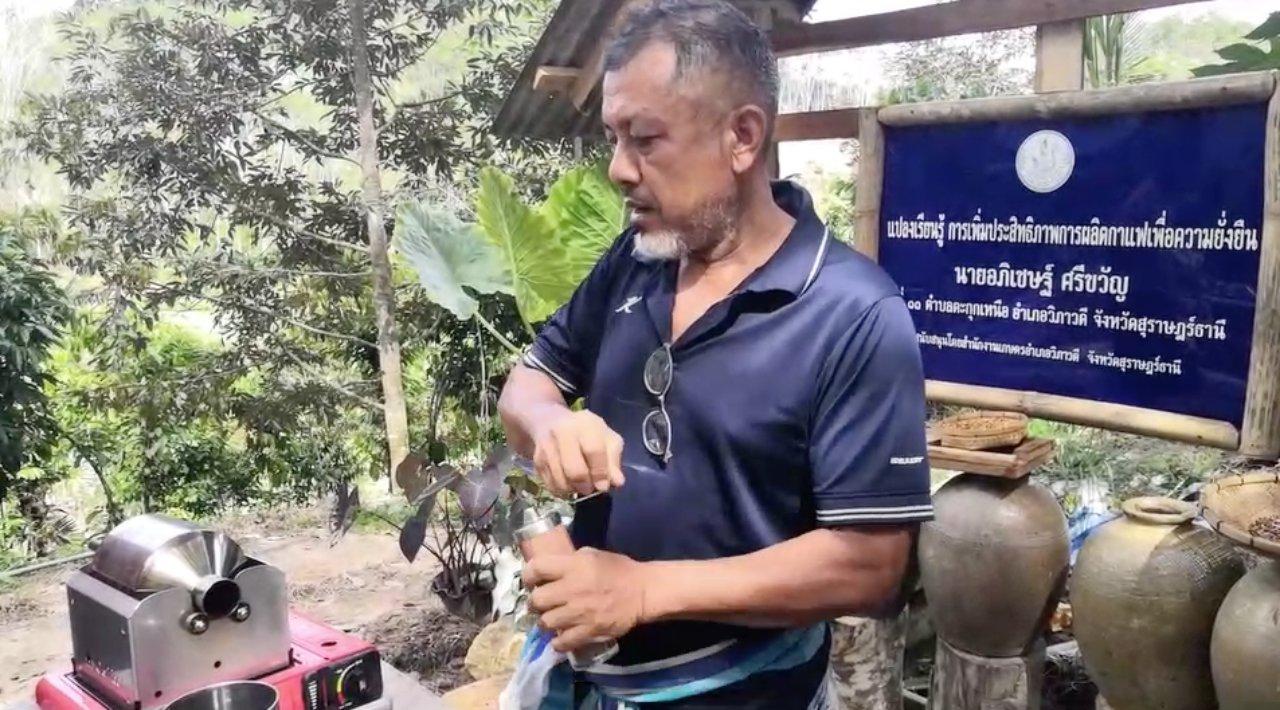 นายอภิเชษฐ์ ศรีขวัญ เจ้าของแปลงเรียนรู้การเพิ่มประสิทธิภาพการผลิตกาแฟเพื่อความยั่งยืน หมู่ที่ 11 ต.ตะกุกเหนือ อ.วิภาวดี จ.สุราษฎร์ธานี กล่าวว่า เมื่อ 30 ปีที่ผ่านมาที่ดินแปลงนี้ได้เริ่มปลูกกาแฟสายพันธุ์มาก่อน แต่ด้วยสมัยนั้นการบริโภคกาแฟยังไม่เป็นที่ต้องการของผู้บริโภคมากนักอีกทั้งราคาก็ตกต่ำ จึงได้โค่นกาแฟทิ้งมาปลูกยางพารา เมื่อปลูกยางพาราได้ไม่กี่ปี ราคายางพาราก็ตกต่ำอีก ตนจึงได้ออกจากพื้นที่ไปประกอบอาชีพอย่างอื่นๆ และกลับเข้ามาอยู่ในพื้นที่อีกครั้งเมื่อ 5-6 ปีที่ผ่านมา ก็มาปลูกกาแฟอีกครั้ง พร้อมกับปลูกทุเรียน มะพร้าวน้ำหอม โกโก้ ทำเป็นสวนผสมหรือสวนสมรม