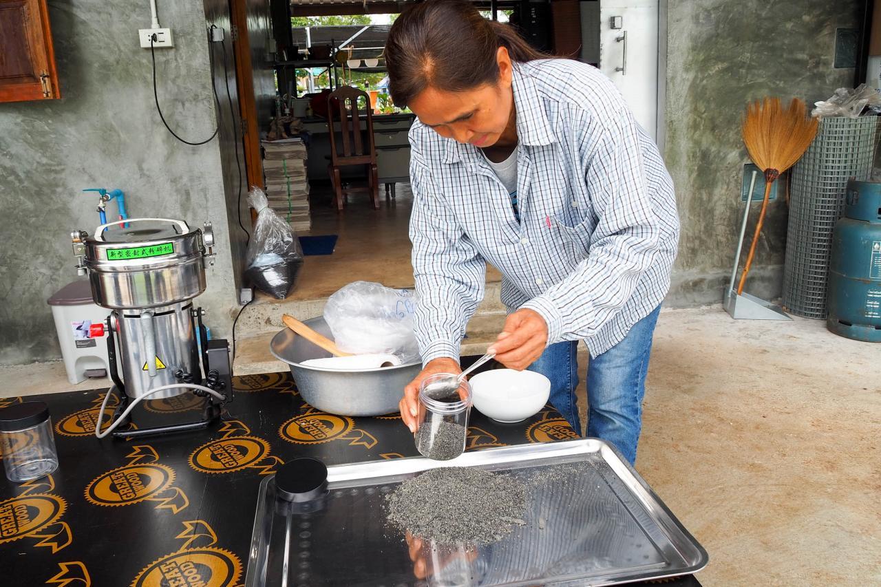 นางขจร ต้นประสงค์ อายุ 53 ปี ชาวบ้าน หมู่ที่ 2 บ้านใหม่สวรรค์พัฒนา ตำบลคลองพิไกร อำเภอพรานกระต่าย จังหวัดกำแพงเพชร เจ้าของไร่เกษตรอินทรีย์โคกหนองนา “ภูแขฟาร์ม” ตำบลคลองพิไกร เจ้าของผลิตภัณฑ์ งาดำอินทรีย์คั่วบดละเอียด “ภูแขฟาร์ม” กล่าวว่า จุดเริ่มต้นก่อนจะมาผลิตงาดำนั้น เริ่มต้นจากการทำโคกหนองนา เพราะมีใจรักในเกษตรอินทรีย์ ประกอบกับอยากจะวางมือจากการทำไร่อ้อยที่มีกว่า 500 ไร่ แรกๆ ก็สลับกับการทำไร่อ้อยและทำเกษตรอินทรีย์ จนสุดท้ายมีเวลามาทำเต็มตัว ในส่วนของการทำงาดำอินทรีย์นั้น เริ่มมาจากเรื่องสุขภาพของตัวเอง ที่ปลูกงาดำอินทรีย์ มาคั่วและบดละเอียดกินเองเพื่อรักษาสุขภาพ จากนั้นแบ่งให้ครอบครัว เพื่อนบ้านได้ลอง ก่อนจะนำออกจำหน่ายเป็นรายได้ที่ดีขึ้นมา
