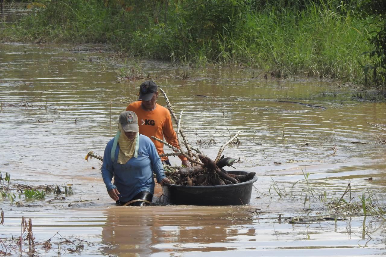 เมื่อเวลา 09.00 น. วันที่ 5 ต.ค. 2566 ผู้สื่อข่าวรายงานว่า นางจิราพร สุริยะ อายุ 43 ปี เกษตรกรชาว ต.ป่ากุมเกาะ อ.สวรรคโลก จ.สุโขทัย พร้อมด้วยญาติ ได้เร่งขุดมันสำปะหลังที่ปลูกไว้จำนวน 3 ไร่ ในพื้นที่หมู่ 13 ต.ป่ากุมเกาะ หลังจากถูกน้ำที่ระบายมาจากแม่น้ำยมล้นตลิ่งไหลเข้าท่วมไร่มันสำปะหลังที่กำลังจะเก็บผลผลิตได้ ต้องจำใจเดินลุยน้ำที่ท่วมไร่มันสำปะหลัง เข้าไปเก็บเกี่ยวผลผลิตก่อนที่จะแช่น้ำเน่าเสียหาย