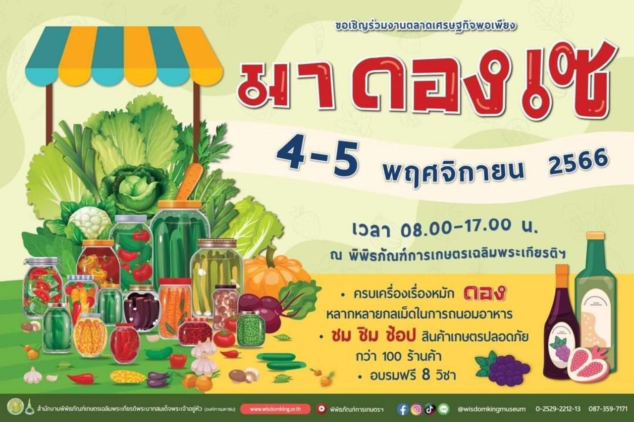 สำนักงานพิพิธภัณฑ์เกษตรเฉลิมพระเกียรติพระบาทสมเด็จพระเจ้าอยู่หัว (องค์การมหาชน) หรือ พกฉ. นอกจากเป็นพิพิธภัณฑ์แห่งการเรียนรู้ เผยแพร่พระเกียรติคุณ และพระอัจฉริยภาพพระบาทสมเด็จพระบรมชนกาธิเบศร มหาภูมิพลอดุลยเดชมหาราช บรมนาถบพิตร พระบาทสมเด็จพระเจ้าอยู่หัว และพระบรมวงศานุวงศ์ ด้านการเกษตร ยังเป็นศูนย์กลางแห่งการขับเคลื่อนหลักปรัชญาของเศรษฐกิจพอเพียงสู่สังคม ผ่านการจัดงานมหกรรม นิทรรศการหมุนเวียน ตลาดเศรษฐกิจพอเพียง ตลาดแห่งมิตรภาพ การแบ่งปันองค์ความรู้และจุดประกายความคิด ก่อร่างสร้างวัฒนธรรมแห่งความพอเพียง สร้างอาชีพ สร้างรายได้ที่มั่นคงให้กับตนเองและชุมชน ส่งต่อผลผลิตปลอดภัยจากแปลง แบ่งปันสู่ผู้บริโภคอย่างต่อเนื่องมากกว่า 10 ปี โดยในเดือนพฤศจิกายน ชูประเด็นเรื่องของหมักดอง ส่งต่อภูมิปัญญาพื้นบ้านด้านการถนอมอาหาร ในงานตลาดเศรษฐกิจพอเพียง มา ดอง เซ วันที่ 4-5 พฤศจิกายน 2566 ณ พิพิธภัณฑ์การเกษตรฯ ปทุมธานี