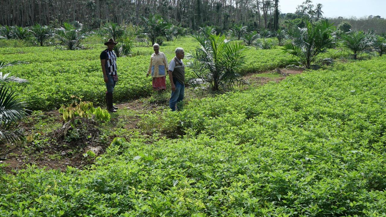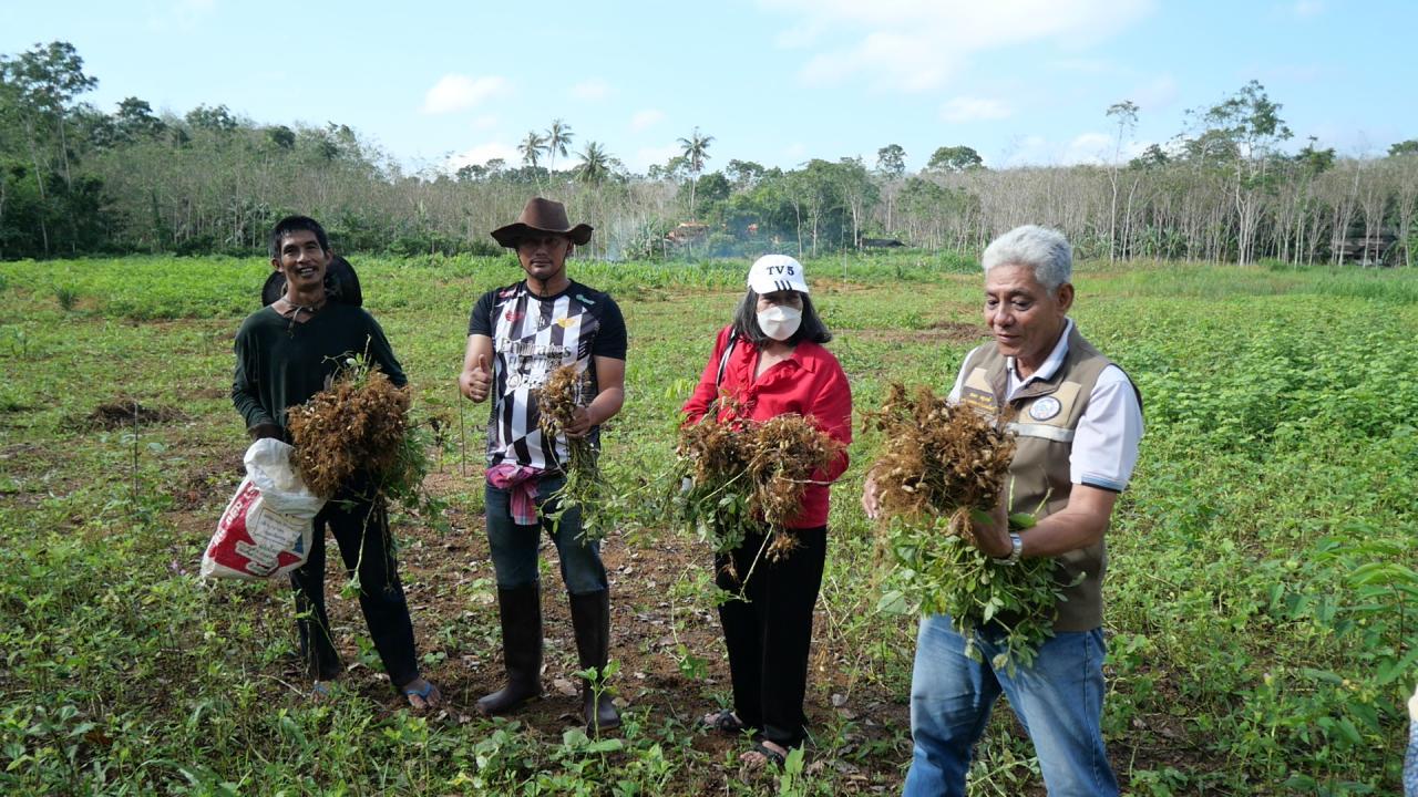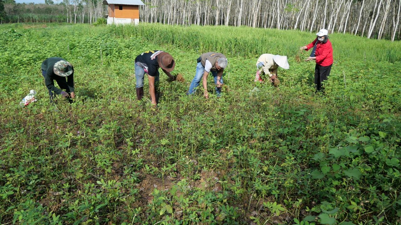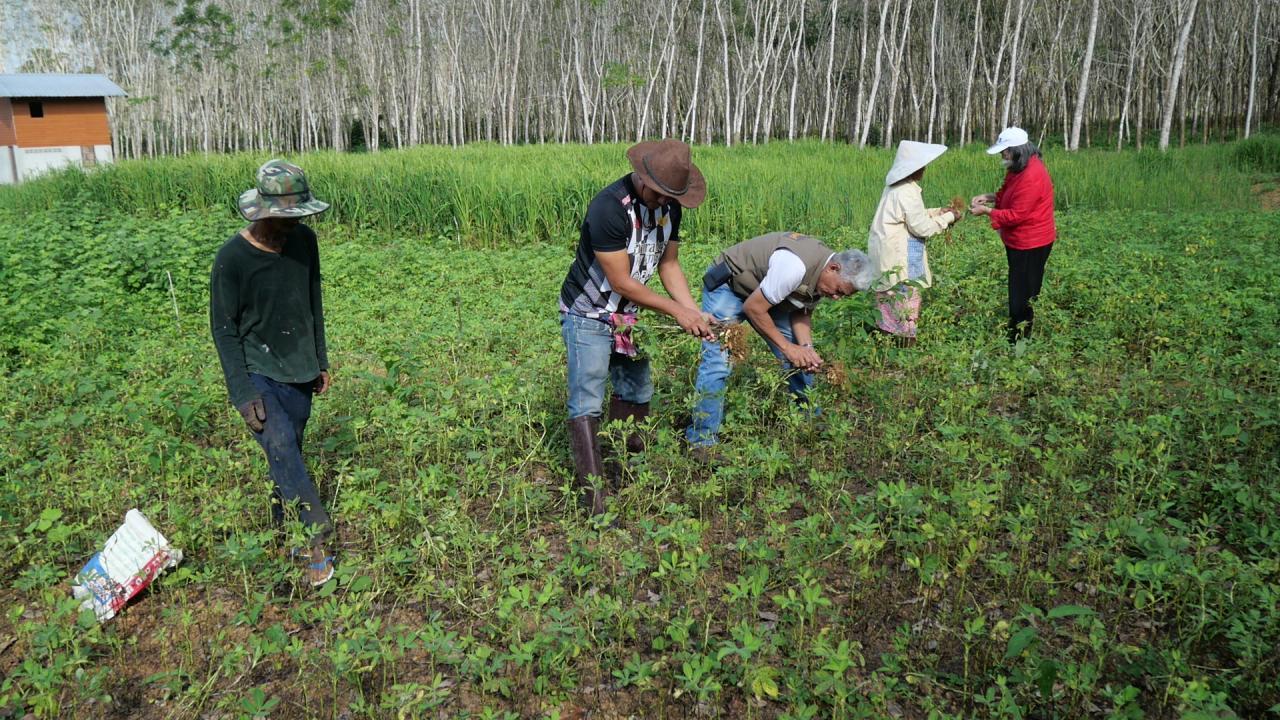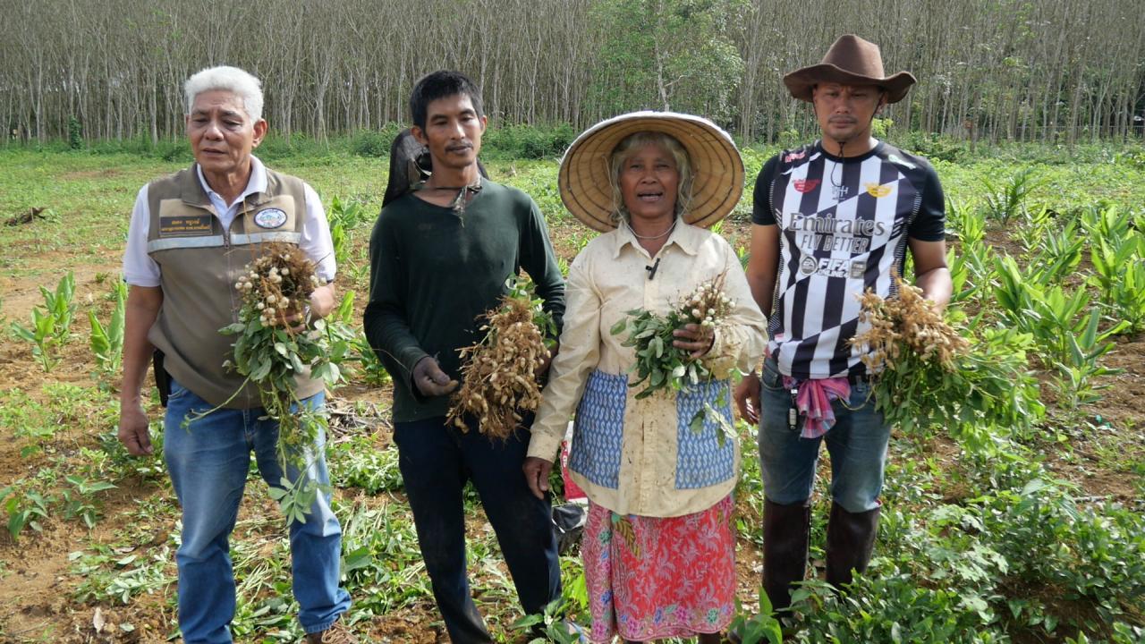 ผู้สื่อข่าวรายงานว่า ที่ จ.ตรัง นายนิคม นาศรี ผู้ใหญ่บ้าน หมู่ 4 บ้านไสเดือย ต.นาหมื่นศรี อ.นาโยง จ.ตรัง พร้อมด้วย นายสนอง หนูวงศ์ อดีตผู้ใหญ่บ้าน หมู่ 7 ต.นาหมื่นศรี พาผู้สื่อข่าวลงพื้นที่แปลงปลูกถั่วลิสงและถั่วฝรั่ง ของนางตาบทิพย์ ศิริสุขวิวัฒน์ อายุ 65 ปี ชาวบ้าน หมู่ 4 ต.นาหมื่นศรี ที่ยึดอาชีพทำการเกษตรปลูกยางพาราและใช้พื้นที่ว่างระหว่างสวนยางพารา สวนปาล์มน้ำมัน และปลูกถั่วลิสงและถั่วฝรั่ง เนื้อที่ประมาณ 4 ไร่ สร้างรายได้เลี้ยงตนเองและครอบครัว