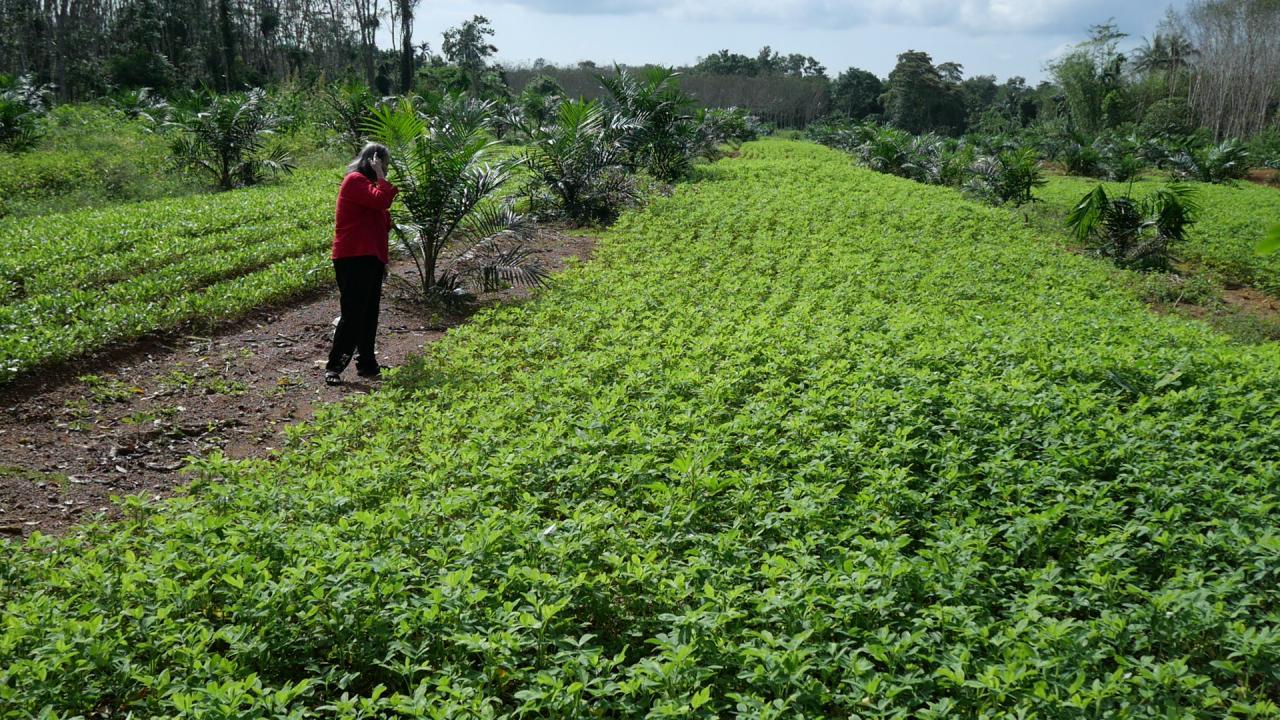 นางตาบทิพย์ กล่าวว่า ตนเองใช้พื้นที่ว่างของสวนยางพาราและสวนปาล์มน้ำมัน มาปลูกถั่วลิสงและถั่วฝรั่ง ปลูกหลายปีแล้ว มีรายได้เลี้ยงตนเองและครอบครัว ในส่วนของพื้นที่ปลูกนั้น บางครั้งก็ไปปลูกในสวนยางพาราหรือสวนปาล์มของเจ้าของที่ที่เพิ่งโค่นยางพาราแล้วปลูกยางพาราใหม่ขึ้นทดแทน ปลูกแบบปลอดสารพิษไม่ใช้สารเคมี มีเพียงการใช้ปูนขาวเพื่อปรับสภาพดินและป้องกันเชื้อรา ใช้ระยะเวลาในการปลูกประมาณ 3-4 เดือน ก็สามารถเก็บผลผลิตไปจำหน่ายได้