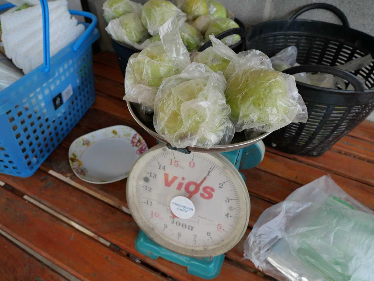 นายธีรวุฒิ กล่าวอีกว่า ในสวนของเราก็มีต้นฝรั่งอยู่ตอนนี้ประมาณ 600 กว่าต้น จุดเด่นของสวนเราจะทำการเก็บทุกๆ วัน ไม่เหมือนสวนที่เขาเป็นมืออาชีพ ที่เขาเก็บทีเดียวพร้อมกันแล้วตัดแต่งกิ่ง อีก 2 เดือนมาห่อ อีก 2 เดือนมาเก็บ ส่วนของเราเก็บทุกวันทุกเช้า อันไหนยังไม่สมบูรณ์เต็มที่เราก็ไม่เก็บ โดยจะทำเครื่องหมายเอาไม้แขวนเสื้อห้อยไว้ตามกิ่ง ให้รู้ว่าพรุ่งนี้ค่อยเก็บนะ จะได้กินของอร่อยๆ หากเป็นสวนอื่นเขาจะเก็บแล้วส่งไปยังพ่อค้าคนกลางก่อน กว่าจะถึงมือผู้บริโภคก็ใช้เวลา 5-7 วัน เพราะฉะนั้นรสชาติของมันก็จะดรอปลงไป แต่ของเราเก็บเช้าขายเย็น รสชาติก็จะสดกว่า นี่คือข้อได้เปรียบของสวนเรา ขณะนี้ ผลผลิตถ้าเฉลี่ยแล้วจะอยู่ที่ประมาณวันละ 40-50 กก. มีเยอะสุดเมื่อวานนี้เก็บได้ถึง 85 กก. ราคาขายหน้าสวน กก.ละ 90 บาท ส่งกรุงเทพฯ กก.ละ 110 บาท