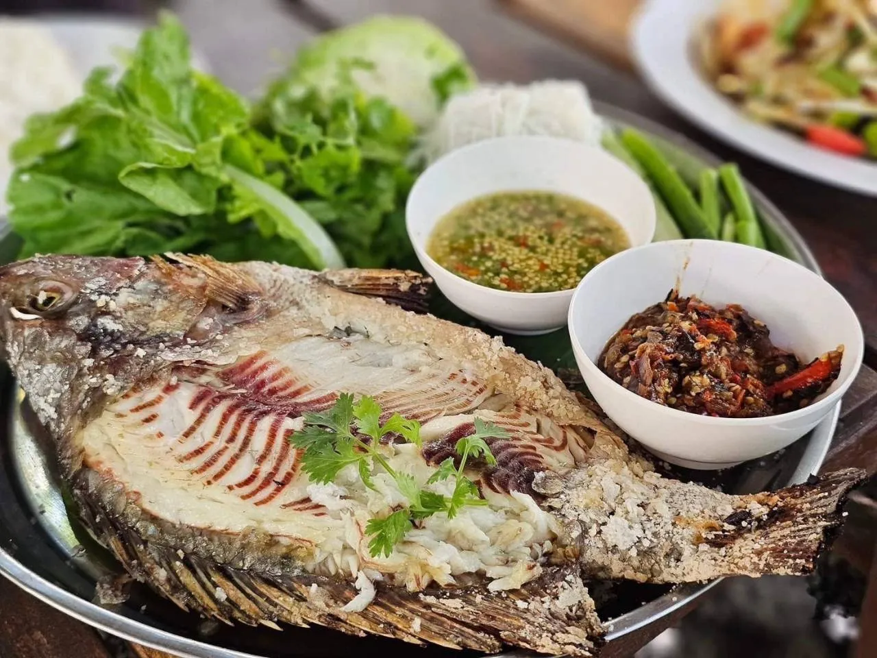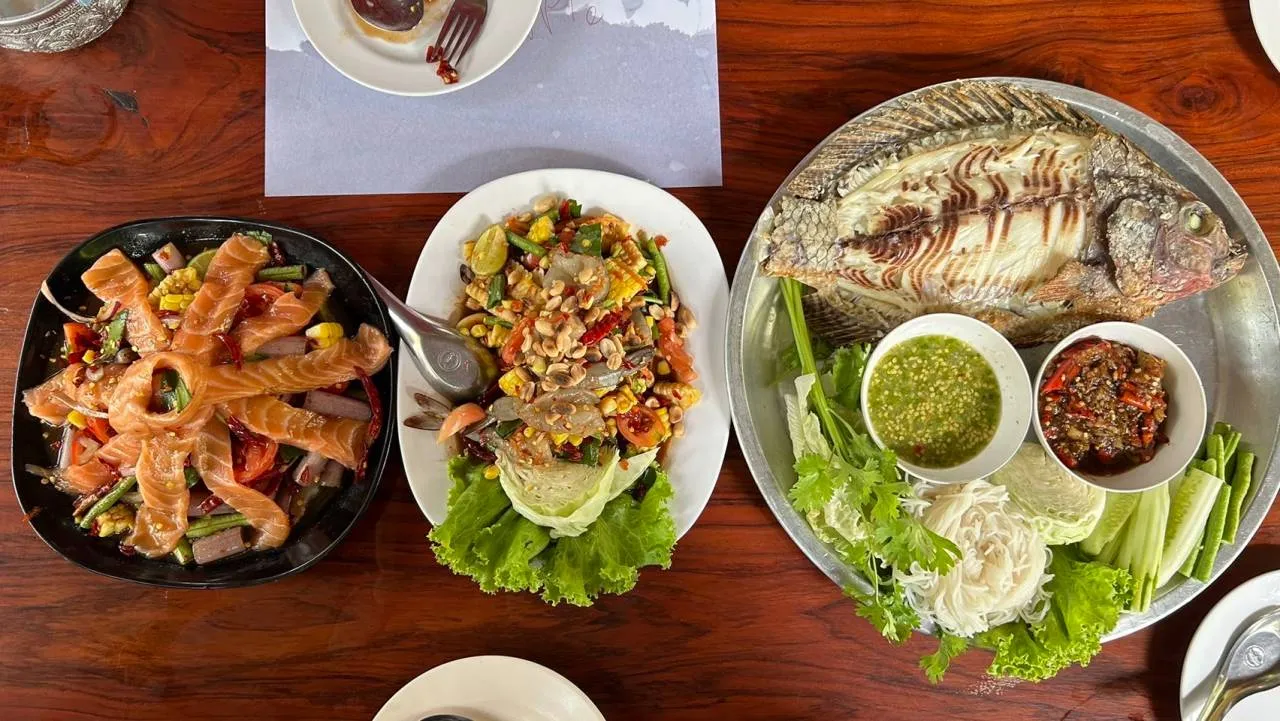 ใสส่วนของเมนูอาหาร มีทั้งไทย จีน และอีสาน ครบวงจร เมนูที่ถือว่าเป็นซิกเนเจอร์ของร้านหลายเมนู เช่น ปากหม้อทะเลหมอก, ปากหม้อ ตู ตูม ตูม หอเผือก, ปากหม้อต้มยำทะเล, แกงคั่วหอยแครงหอยขม, แซลมอนพันกุ้ง, แซลมอนหุ้มหอย, เหลาแซลมอน และยังมีอาหารอีสานอีกหลากหลายเมนู เช่น ส้มตำปูปลาร้า, ตำปูม้า, ตำถั่ว และเมนูอื่นๆ อีกกว่า 50 เมนู โดยเฉพาะปลานิล กับกุ้งแม่น้ำ เป็นผลผลิตที่เลี้ยงเองอยู่ในไร่