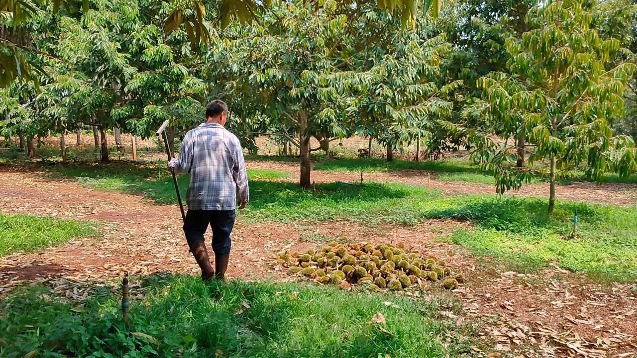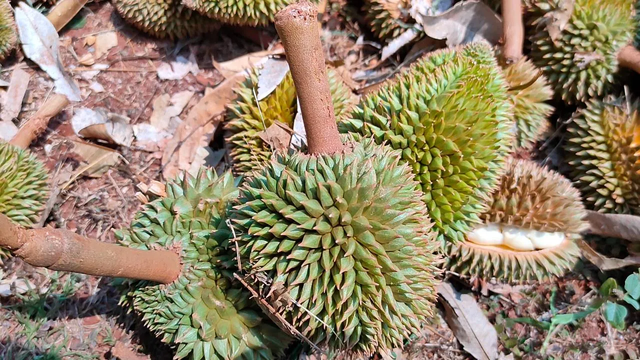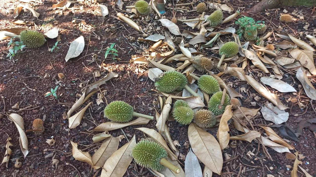 สภาพอากาศที่ จ.ศรีสะเกษ ร้อนระอุต่อเนื่อง ส่งผลกระทบสวนทุเรียนภูเขาไฟที่บ้านโนนสำเริง อ.กันทรลักษ์ สลัดลูกจากต้นผลผลิตหายไปแล้วครึ่งสวน เกษตรกรสุดเสียดาย ต้องเดินก้มหน้าเก็บผลอ่อนใต้ต้นหลายร้อยลูกทุกวัน