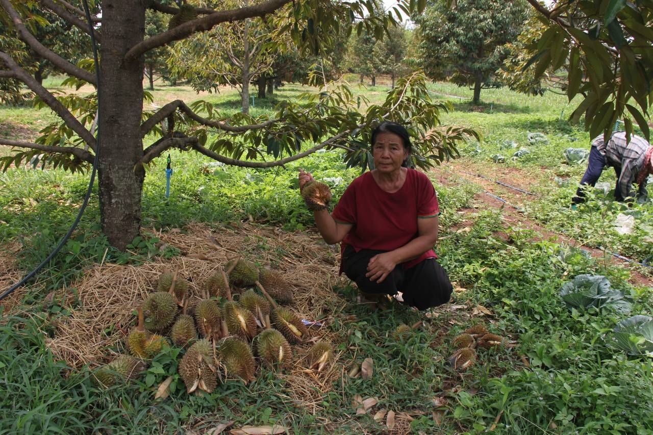 นางทองใส กล่าวว่า ตัวเองปลูกทุเรียนมาเข้าสู่ปีที่ 5-6 และได้เคยเก็บผลผลิตมาแล้ว 1-2 ปี ก่อนหน้านี้ซึ่งก็ได้พอกินและขายบ้าง แต่พอมาปีนี้ในขณะที่ผลผลิตทุเรียนกำลังจะได้ออกสู่ท้องตลาด แต่ทุเรียนกลับได้รับผลกระทบจากภัยแล้ง และอากาศที่ร้อนจัด ทำให้ใบทุเรียนไหม้ ส่วนลูกทุเรียนที่กำลังจะได้เก็บเกี่ยวในอีก 1-2 เดือนข้างหน้า ก็ไม่สามารถทนต่อสภาพอากาศร้อนได้ ทำให้ทุเรียนปริแตก และร่วงหล่นลงมาจากต้น ซึ่งในระยะนี้รวมๆ ลูกทุเรียนที่แตกและร่วงหล่นลงมาสู่พื้น มีจำนวนไม่ต่ำกว่า 100 ลูก